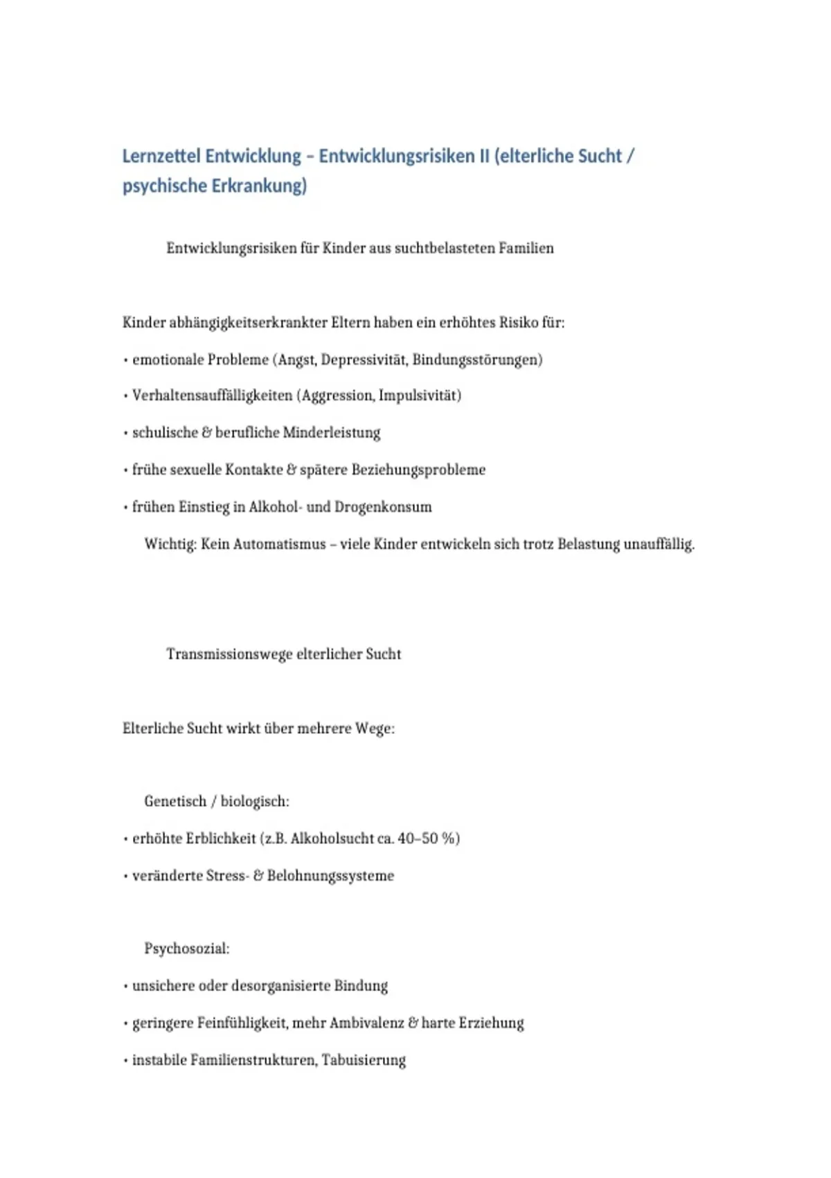 Lernzettel Entwicklung – Entwicklungsrisiken II (elterliche Sucht /