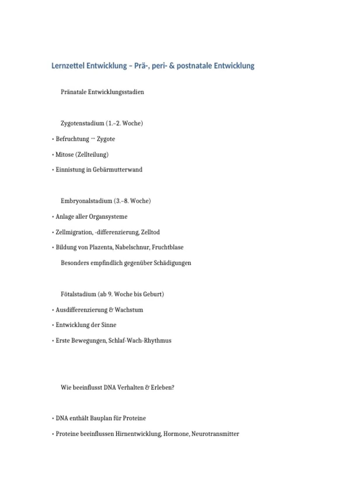 Zusammenfassung Lernzettel Entwicklungspsychologie Perinatale Entwicklung