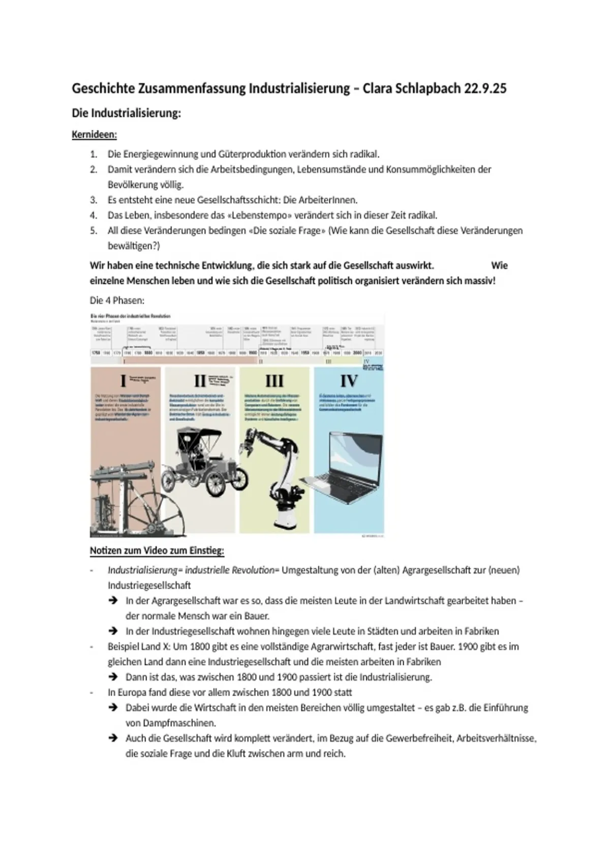 Geschichte Zusammenfassung Industrialisierung – Clara Schlapbach 22.9.25
