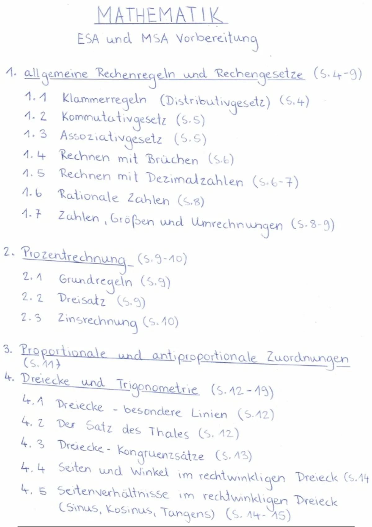 Dieses 38-seitige Lernzettelpaket bietet eine vollständige und verständliche Vorbereitung auf den ESA und MSA im Fach Mathematik in Schleswig-Holstein. Alle Inhalte sind übersichtlich, stichpunktartig und prüfungsnah aufbereitet – von grundlegenden Rechenregeln bis hin zu Funktionen und Trigonometrie. Das Dokument eignet sich besonders zum Wiederholen, Festigen und gezielten Lernen vor Klassenarbeiten oder der Abschlussprüfung. Geeignet für: – ESA- und MSA-Schüler*innen – Gemeinschaftsschule, Stadtteilschule & Gymnasium (Klasse 9/10) – zur Prüfungsvorbereitung oder zum strukturierten Wiederholen Inhalt (u. a.): – allgemeine Rechenregeln und Rechengesetze – Bruch- und Dezimalrechnung, rationale Zahlen – Prozent- und Zinsrechnung – proportionale und antiproportionale Zuordnungen – Dreiecke und Trigonometrie (Sinus, Kosinus, Tangens, Pythagoras) – Strahlensätze – Mittelwert, Durchschnitt, Median – binomische Formeln – Potenzen und Potenzgesetze – lineare, exponentielle und quadratische Funktionen Besonderheiten: – klare Merksätze und Rechenwege – viele anschauliche Skizzen und Beispiele – übersichtliches Inhaltsverzeichnis – erstellt von einer Schülerin mit sehr guten Leistungen