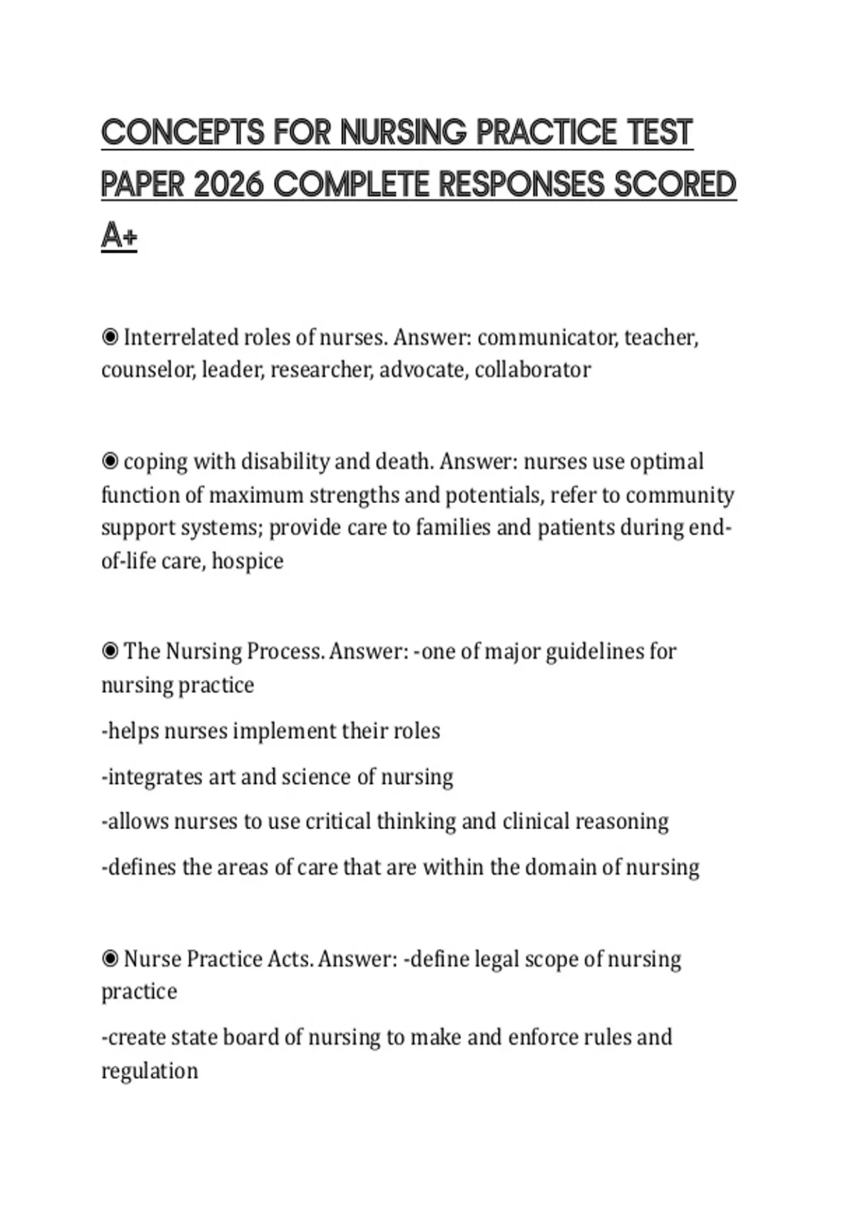 CONCEPTS FOR NURSING PRACTICE TEST PAPER 2026 COMPLETE RESPONSES SCORED A+