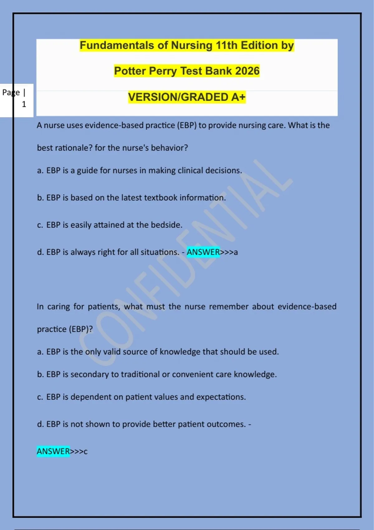 Fundamentals of Nursing 11th Edition by Potter Perry Test Bank 2026 VERSION/GRADED A+ Fundamentals of Nursing 11th Edition by Potter Perry Test Bank 2026 VERSION/GRADED A+