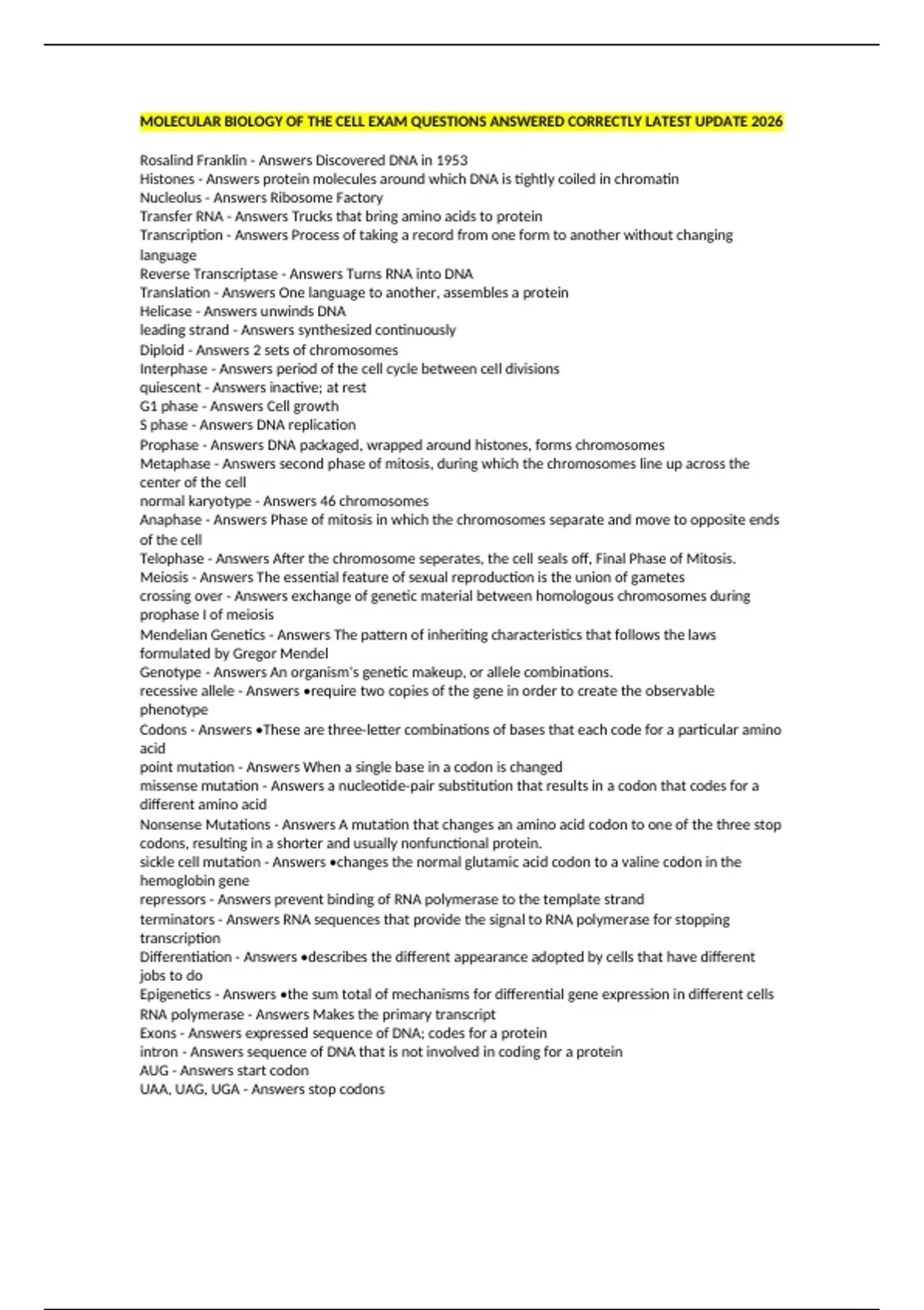 MOLECULAR BIOLOGY OF THE CELL EXAM QUESTIONS ANSWERED CORRECTLY LATEST UPDATE 2026 Rosalind Franklin - Answers Discovered DNA in 1953 Histones - Answers protein molecules around which DNA is tightly coiled in chromatin Nucleolus - Answers Ribosome Factory Transfer RNA - Answers Trucks that bring amino acids to protein Transcription - Answers Process of taking a record from one form to another without changing language Reverse Transcriptase - Answers Turns RNA into DNA Translation - Answers One language to another, assembles a protein Helicase - Answers unwinds DNA leading strand - Answers synthesized continuously Diploid - Answers 2 sets of chromosomes Interphase - Answers period of the cell cycle between cell divisions quiescent - Answers inactive; at rest G1 phase - Answers Cell growth S phase - Answers DNA replication Prophase - Answers DNA packaged, wrapped around histones, forms chromosomes Metaphase - Answers second phase of mitosis, during which the chromosomes line up across the center of the cell normal karyotype - Answers 46 chromosomes Anaphase - Answers Phase of mitosis in which the chromosomes separate and move to opposite ends of the cell Telophase - Answers After the chromosome seperates, the cell seals off, Final Phase of Mitosis. Meiosis - Answers The essential feature of sexual reproduction is the union of gametes crossing over - Answers exchange of genetic material between homologous chromosomes during prophase I of meiosis Mendelian Genetics - Answers The pattern of inheriting characteristics that follows the laws formulated by Gregor Mendel Genotype - Answers An organism's genetic makeup, or allele combinations. recessive allele - Answers •require two copies of the gene in order to create the observable