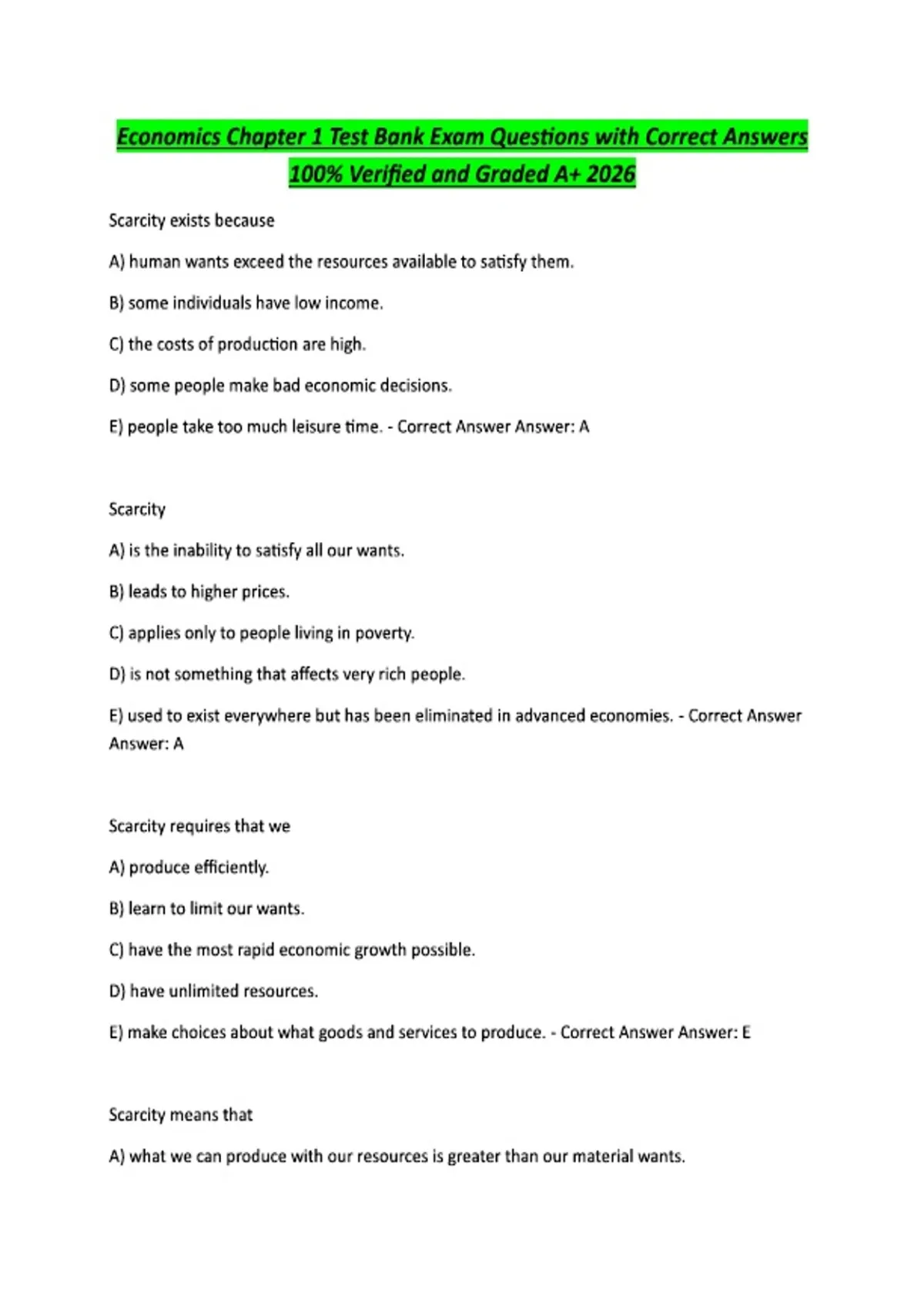 Economics Chapter 1 Test Bank Exam Questions with Correct Answers 100% Verified and Graded A+ 2026 Scarcity exists because A) human wants exceed the resources available to satisfy them. B) some individuals have low income. C) the costs of production are high. D) some people make bad economic decisions. E) people take too much leisure time. - Correct Answer Answer: A Scarcity A) is the inability to satisfy all our wants. B) leads to higher prices. C) applies only to people living in poverty. D) is not something that affects very rich people. E) used to exist everywhere but has been eliminated in advanced economies. - Correct Answer Answer: A Scarcity requires that we A) produce efficiently. B) learn to limit our wants. C) have the most rapid economic growth possible. D) have unlimited resources. E) make choices about what goods and services to produce. - Correct Answer Answer: E Scarcity means that A) what we can produce with our resources is greater than our material wants.