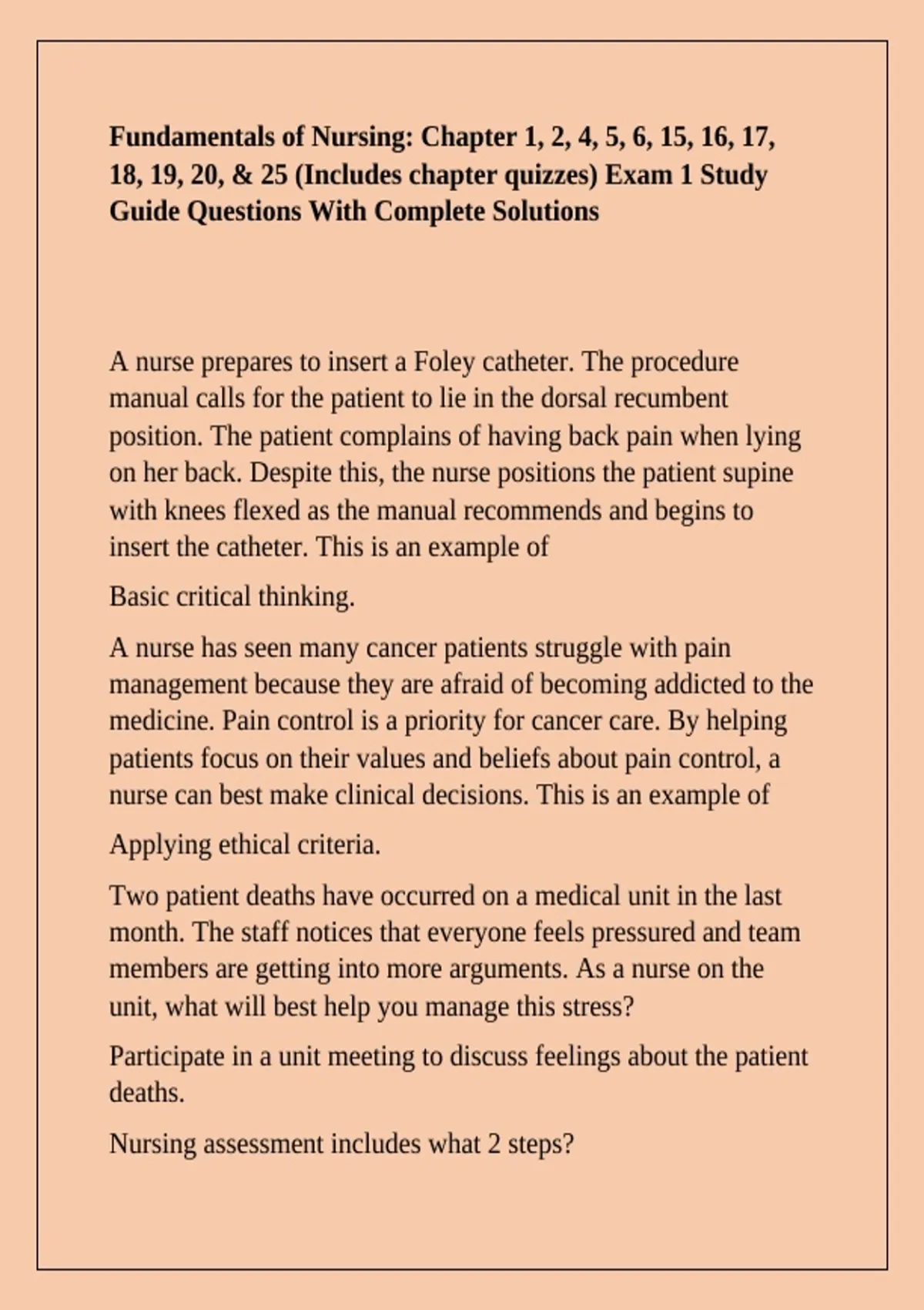 Fundamentals of Nursing: Chapter 1, 2, 4, 5, 6, 15, 16, 17, 18, 19, 20, & 25 (Includes chapter quizzes) Exam 1 Study Guide Questions With Complete Solutions