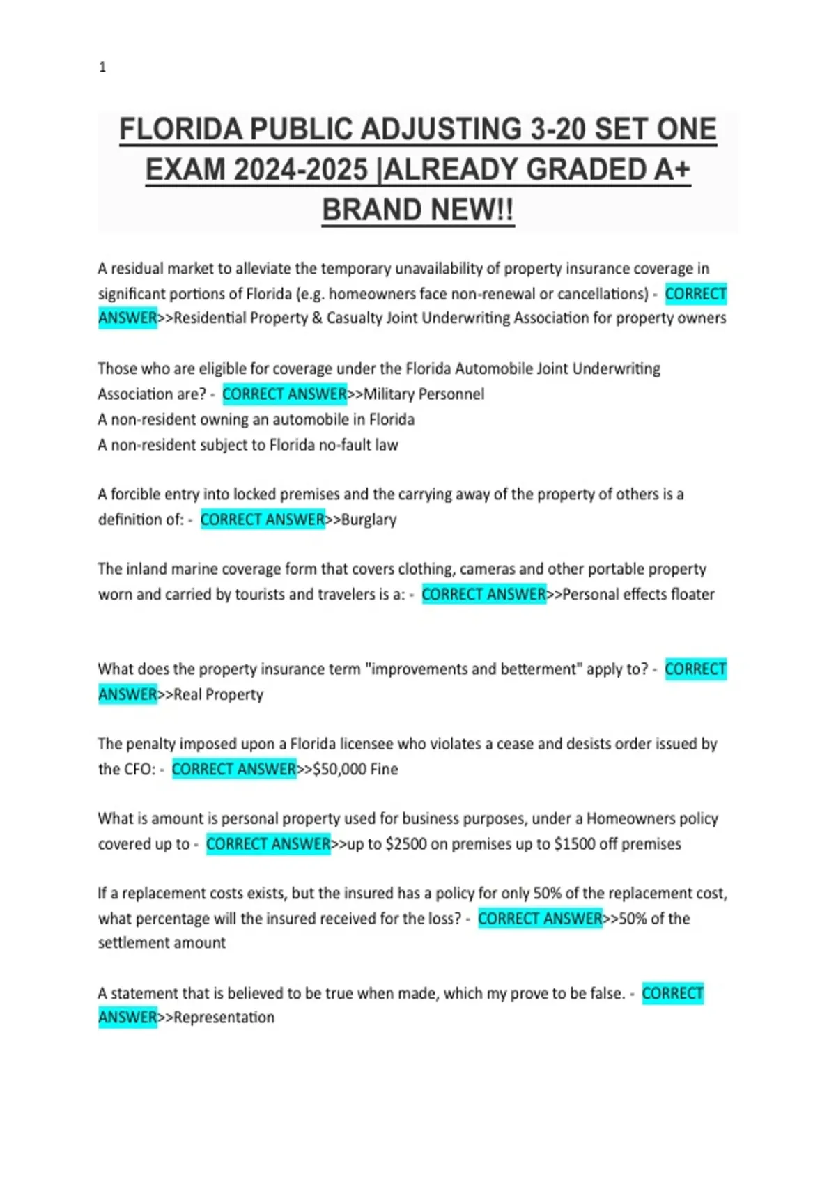 FLORIDA PUBLIC ADJUSTING 3-20 SET ONE EXAM
