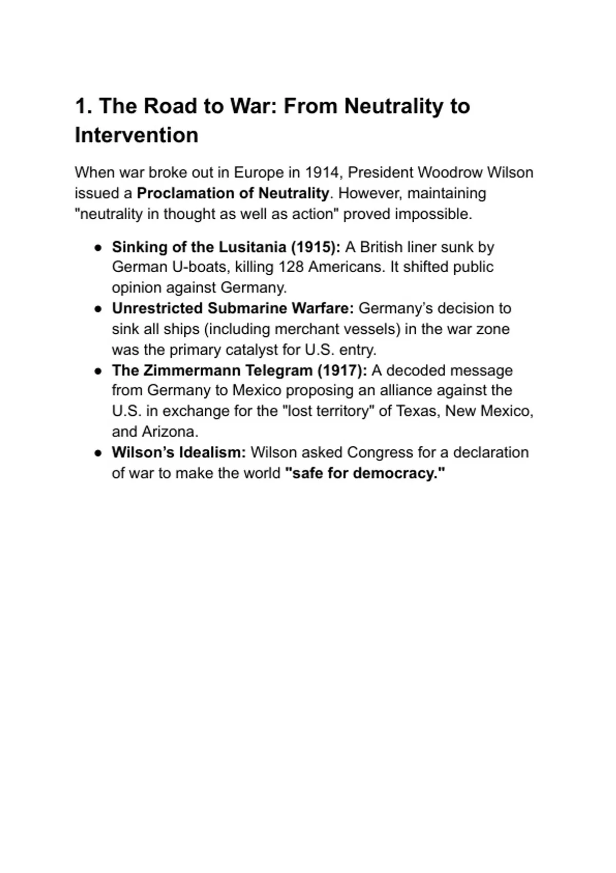 The document describes the transition from neutrality to intervention in World War I due to German provocations and President Wilson’s idealism. It describes the "Total War" mobilization on the home front, which expanded federal power, shifted national demographics, and led to the suppression of civil liberties. Finally, it explains how the post-war peace process failed domestically, as the Senate rejected the Treaty of Versailles and the League of Nations, resulting in a return to isolationism.