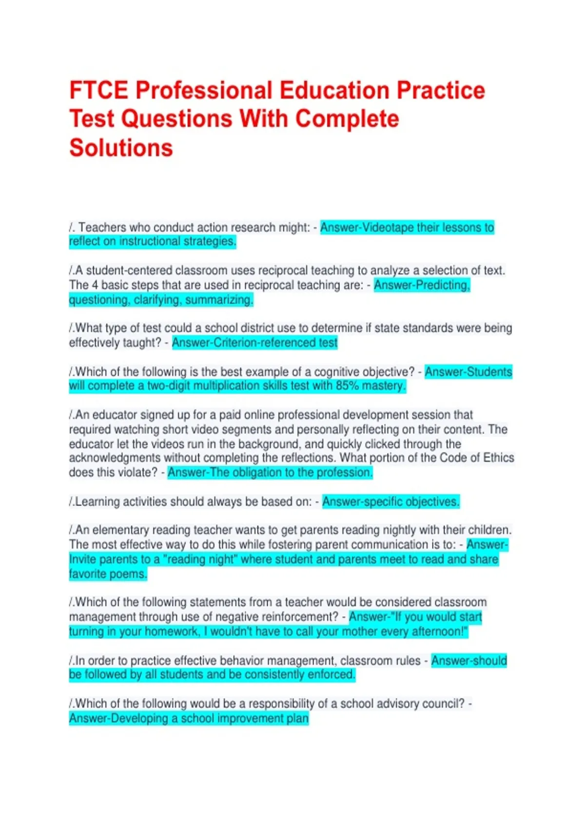 FTCE Professional Education Practice Test Questions With Complete Solutions /. Teachers who conduct action research might: - Answer-Videotape their lessons to reflect on instructional strategies. /.A student-centered classroom uses reciprocal teaching to analyze a selection of text. The 4 basic steps that are used in reciprocal teaching are: - Answer-Predicting, questioning, clarifying, summarizing. /.What type of test could a school district use to determine if state standards were being effectively taught? - Answer-Criterion-referenced test /.Which of the following is the best example of a cognitive objective? - Answer-Students will complete a two-digit multiplication skills test with 85% mastery. /.An educator signed up for a paid online professional development session that required watching short video segments and personally reflecting on their content. The educator let the videos run in the background, and quickly clicked through the acknowledgments without completing the reflections. What portion of the Code of Ethics does this violate? - Answer-The obligation to the profession. /.Learning activities should always be based on: - Answer-specific objectives. /.An elementary reading teacher wants to get parents reading nightly with their children. The most effective way to do this while fostering parent communication is to: - Answer-Invite parents to a "reading night" where student and parents meet to read and share favorite poems. /.Which of the following statements from a teacher would be considered classroom management through use of negative reinforcement? - Answer-"If you would start turning in your homework, I wouldn't have to call your mother every afternoon!" /.In order to practice effective behavior management, classroom rules - Answer-should be followed by all students and be consistently enforced. /.Which of the following would be a responsibility of a school advisory council? - Answer-Developing a school improvement plan /.Which of the following would be an example of negative reinforcement? - Answer-The teacher stops complaining about the messy floor after the students clean it up. /.A teacher has discovered and implemented a new online behavior-management program that is improving student behavior while providing an easy way to communicate with parents. The teacher should - Answer-Meet with the principal to discussing sharing the new product at the next professional development day. /.The best tool for a teacher to use to keep a running, averaged record of student scores throughout the year is - Answer-Spreadsheet /.The most effective way to present vocabulary is - Answer-in context to convey rich meaning to the students. /.The best graphic organizer for analyzing similarities and differences is - Answer-a Venn diagram /.An ELL joins the classroom mid-year. She appears to speak fluent English and participates well in class, yet struggles academically in reading and science. When questioned, the teacher learns that the student has only lived in America for 2 years. The student's academic struggles are likely the result of - Answer-Not having mastered cognitive academic language proficiency due to the length of time she has been speaking English. /.The input-hypothesis model developed by Steven Krashen would suggest that ELLs would benefit from - Answer-Being given information that is just slightly above their ability level in the second language. /.The No Child Left Behind Act states that - Answer-Student whose first language is not English may only be tested in English. /.Student test performance reflects - Answer-a student's understanding of the topic and the quality of instruction. /.When teaching idioms it is important to - Answer-Explicitly teach the implied meaning of the phrase. /.A teacher wants to know if he is allowed to copy software onto more of his classroom computers. To find this out he should consult the - Answer-site license /.A student comes to school and says that her report is done but she is out of ink on her home printer. She asks the teacher if she can email the assignment to school and have the teacher print it out. The teacher should - Answer-be cautious because emails can contain viruses.