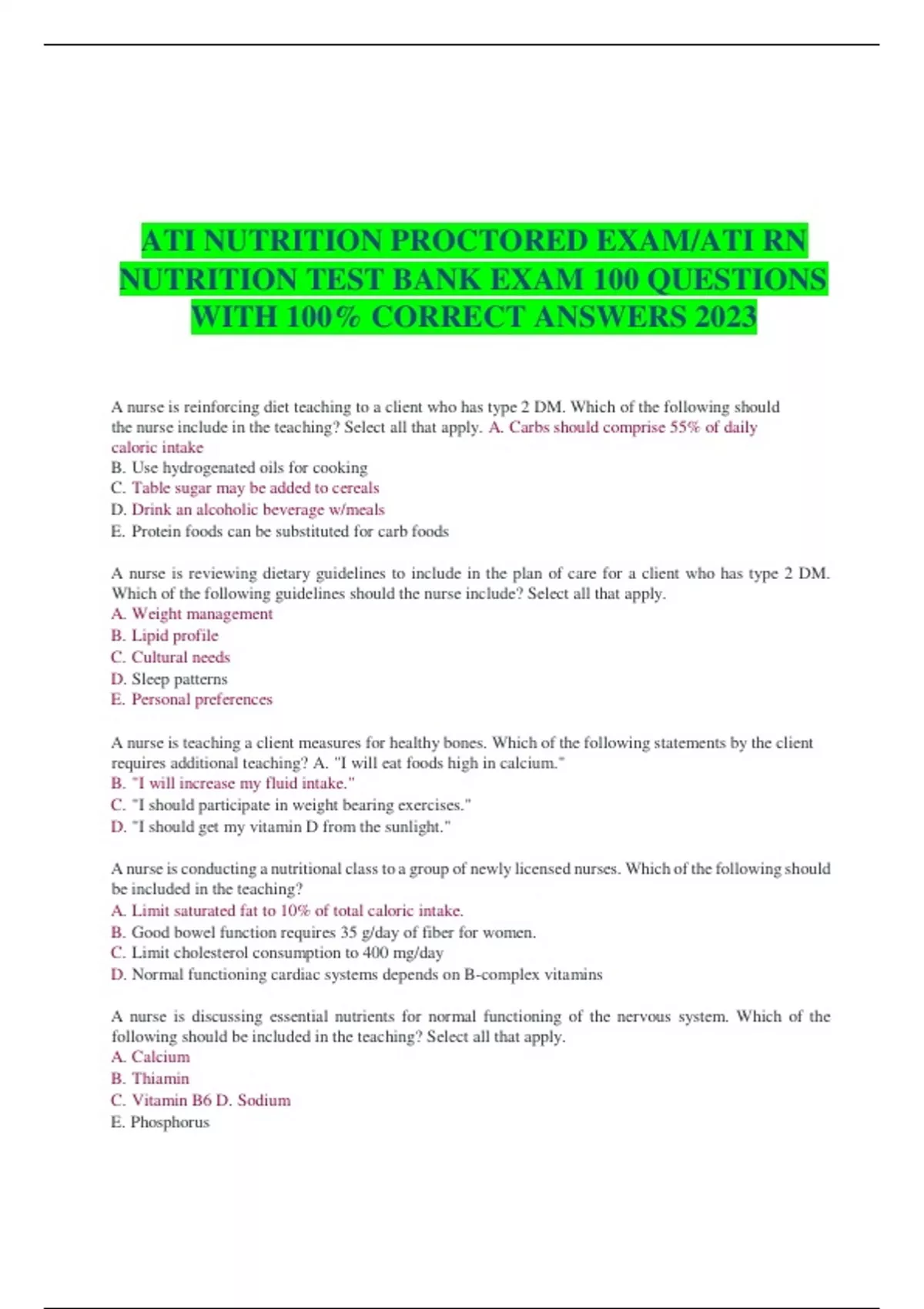ATI NUTRITION PROCTORED EXAM