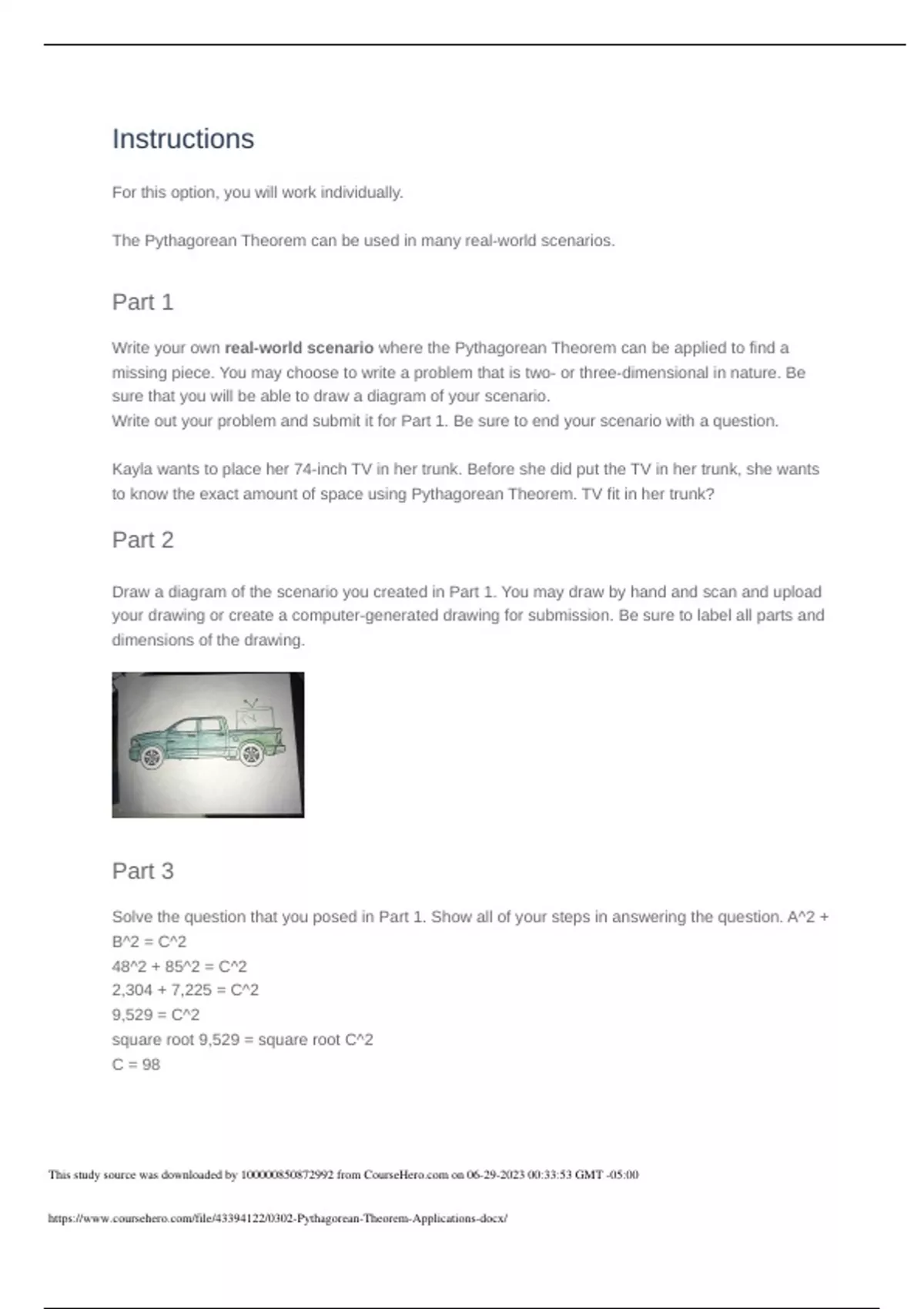 Instructions For this option, you will work individually. The Pythagorean Theorem can be used in many real-world scenarios. Part 1 Write your own real-world scenario where the Pythagorean Theorem can be applied to find a missing piece. You may choose to write a problem that is two- or three-dimensional in nature. Be sure that you will be able to draw a diagram of your scenario. Write out your problem and submit it for Part 1. Be sure to end your scenario with a question. Kayla wants to place her 74-inch TV in her trunk. Before she did put the TV in her trunk, she wants to know the exact amount of space using Pythagorean Theorem. TV fit in her trunk? Part 2 Draw a diagram of the scenario you created in Part 1. You may draw by hand and scan and upload your drawing or create a computer-generated drawing for submission. Be sure to label all parts and dimensions of the drawing. Part 3 Solve the question that you posed in Part 1. Show all of your steps in answering the question. A^2 + B^2 = C^2 48^2 + 85^2 = C^2 2,304 + 7,225 = C^2 9,529 = C^2 square root 9,529 = square root C^2