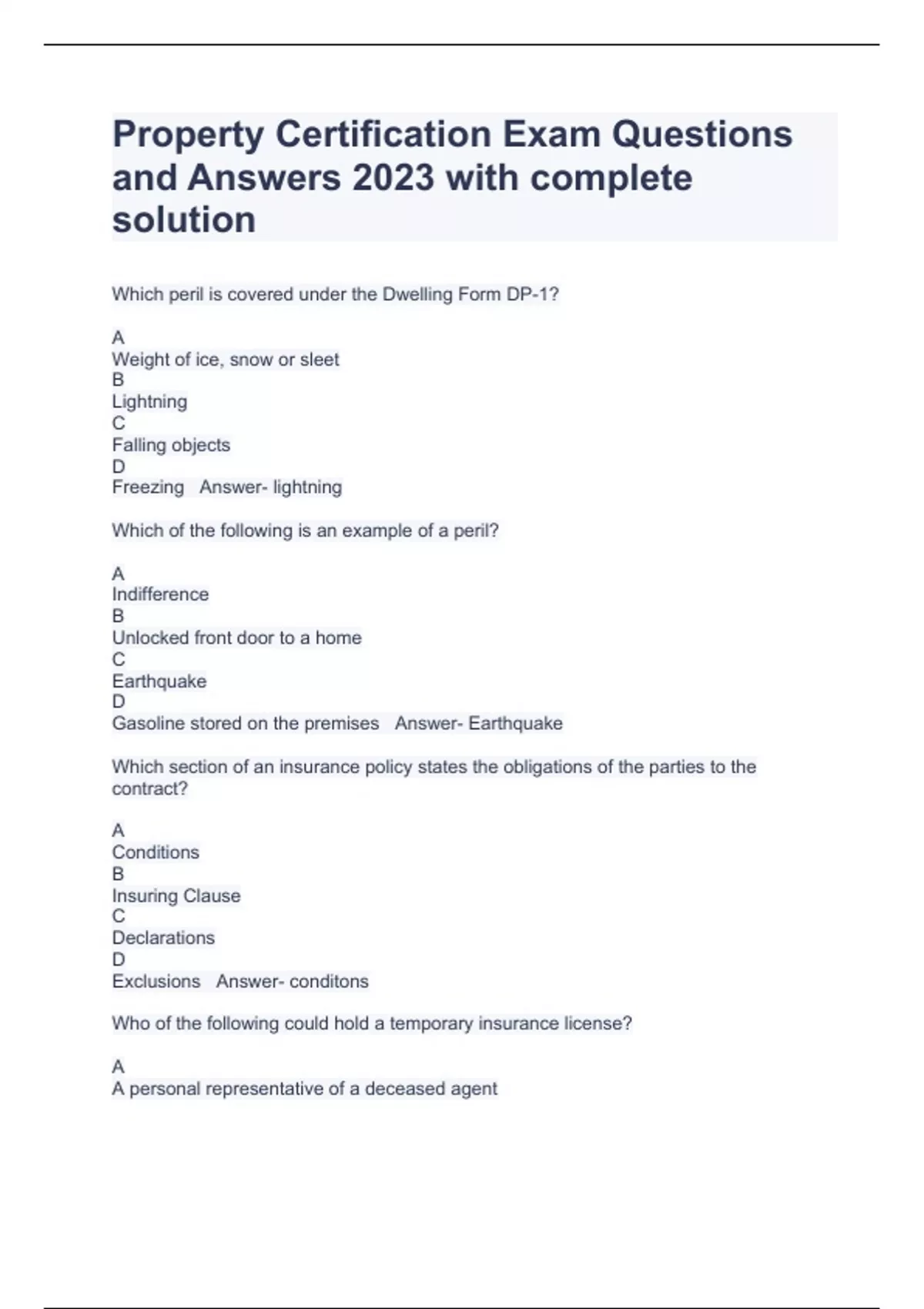 Property Certification Exam Questions and Answers 2023 with complete solution