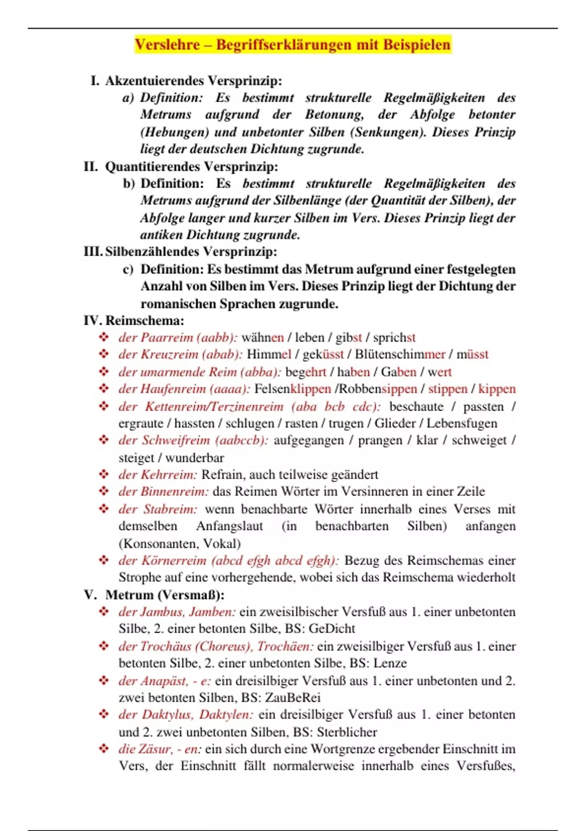 A document suitable for first year Literature studies students, not only German studies. The summary deals with key terms of poetry analysis, structure of lines, strophes, rhythm and meaning of formal characteristics for the interpretation of poetry. The notes enable instrumentarium for all kinds of poems of diverse national literatures.