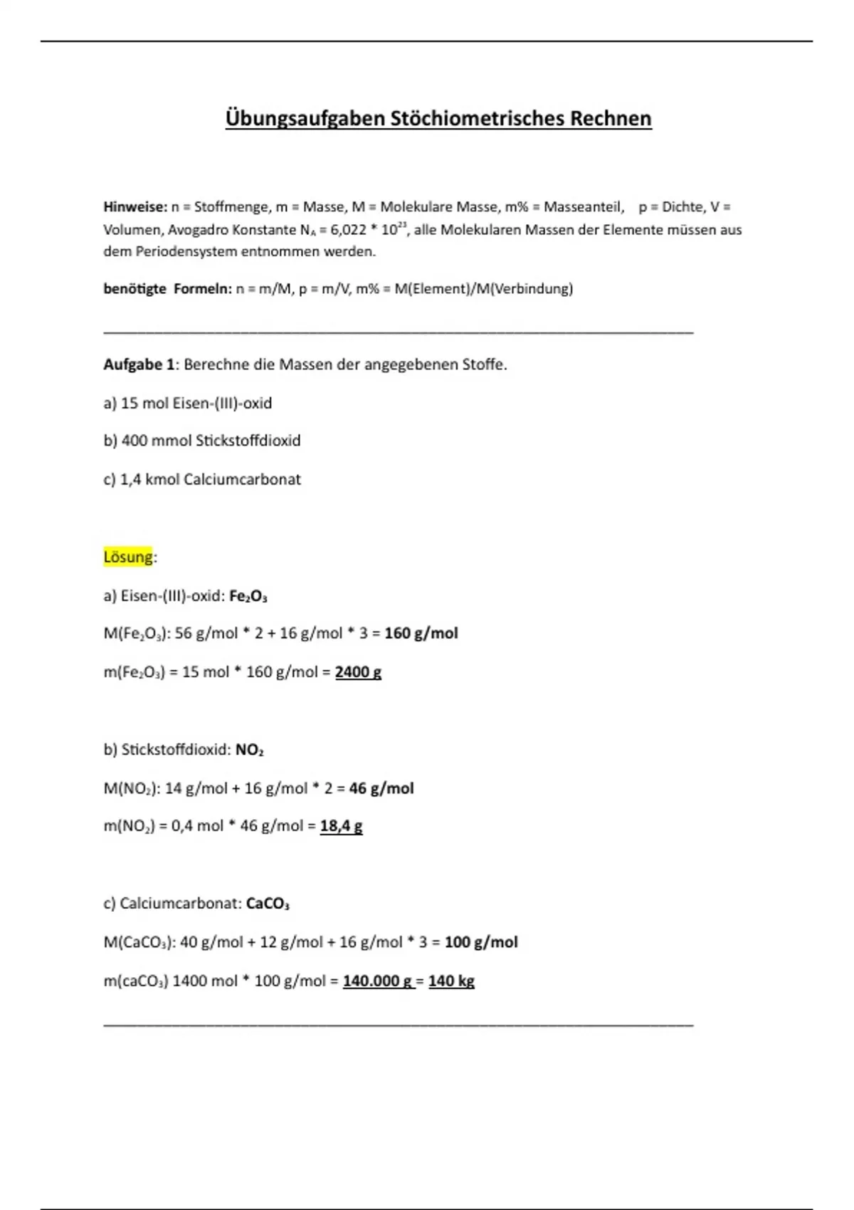 benötigte Formeln: n = m/M, p = m/V, m% = M(Element)/M(Verbindung)