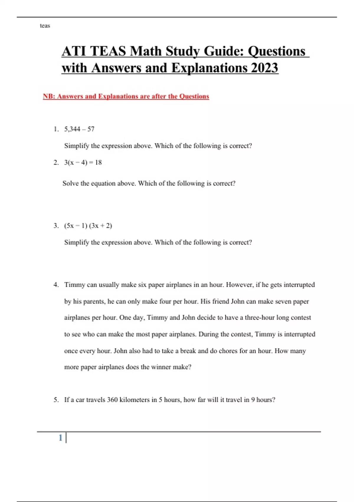 ATI TEAS Math Study Guide: Questions with Answers and Explanations 2023 NB: Answers and Explanations are after the Questions 1. 5,344 – 57 Simplify the expression above. Which of the following is correct? 2. 3(x − 4) = 18 Solve the equation above. Which of the following is correct? 3. (5x − 1) (3x + 2) Simplify the expression above. Which of the following is correct? 4. Timmy can usually make six paper airplanes in an hour. However, if he gets interrupted by his parents, he can only make four per hour. His friend John can make seven paper airplanes per hour. One day, Timmy and John decide to have a three-hour long contest to see who can make the most paper airplanes. During the contest, Timmy is interrupted once every hour. John also had to take a break and do chores for an hour. How many more paper airplanes does the winner make? 5. If a car travels 360 kilometers in 5 hours, how far will it travel in 9 hours? 6. What degrees Fahrenheit is it at 30 degrees Celsius? Note: °F = (°C * 9/5) + 32 7. 0.27 x 0.56 Simplify the expression above. Which of the following is correct? 8. At a comic book store, Robert purchased three comics for $2.65 each. If he paid with a $20 bill, how much change did he receive? 9. 10. Express 5/8 as its closest rounded percentage. 11. Amanda wants to paint the walls of a room. She knows that each can of paint contains one gallon. A half gallon will cover a 55 square feet of wall. Each of the four walls is 10 feet high. Two of the walls are 10 feet wide and two of the walls are 15 feet wide. How many 1-gallon buckets of paint does Amanda need to buy in order to fully paint the room? 12. How many millimeters are there in 5 meters? 13. 0.67 x 0.09? Simplify the expression above. 14. 2 − 8 ÷ (24 ÷ 2) =