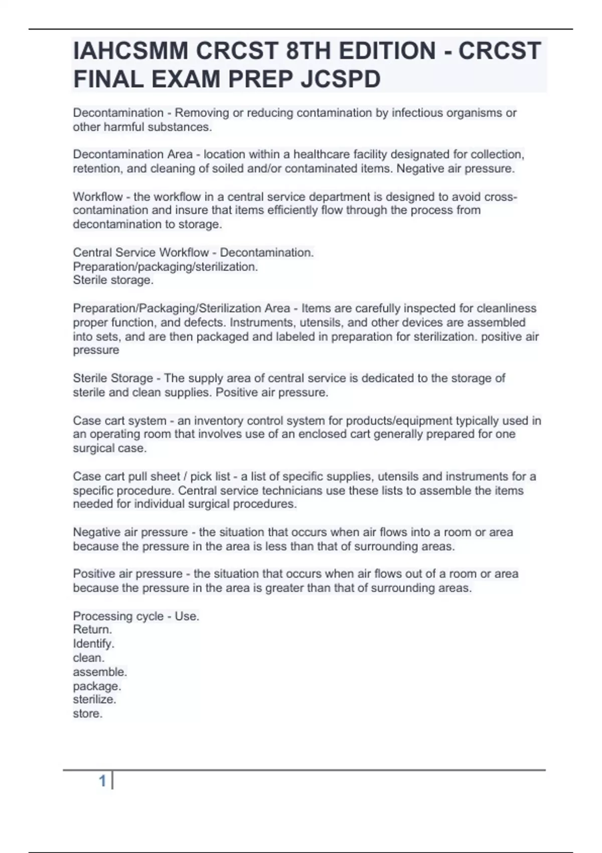 IAHCSMM CRCST 8TH EDITION - CRCST FINAL EXAM PREP JCSPD Decontamination - Removing or reducing contamination by infectious organisms or other harmful substances. Decontamination Area - location within a healthcare facility designated for collection, retention, and cleaning of soiled and/or contaminated items. Negative air pressure. Workflow - the workflow in a central service department is designed to avoid cross- contamination and insure that items efficiently flow through the process from decontamination to storage. Central Service Workflow - Decontamination. Preparation/packaging/sterilization. Sterile storage. Preparation/Packaging/Sterilization Area - Items are carefully inspected for cleanliness proper function, and defects. Instruments, utensils, and other devices are assembled into sets, and are then packaged and labeled in preparation for sterilization. positive air pressure Sterile Storage - The supply area of central service is dedicated to the storage of sterile and clean supplies. Positive air pressure. Case cart system - an inventory control system for products/equipment typically used in an operating room that involves use of an enclosed cart generally prepared for one surgical case. Case cart pull sheet / pick list - a list of specific supplies, utensils and instruments for a specific procedure. Central service technicians use these lists to assemble the items needed for individual surgical procedures. Negative air pressure - the situation that occurs when air flows into a room or area because the pressure in the area is less than that of surrounding areas. Positive air pressure - the situation that occurs when air flows out of a room or area because the pressure in the area is greater than that of surrounding areas. Processing cycle - Use. Return. Identify. clean. assemble. package. sterilize. store.