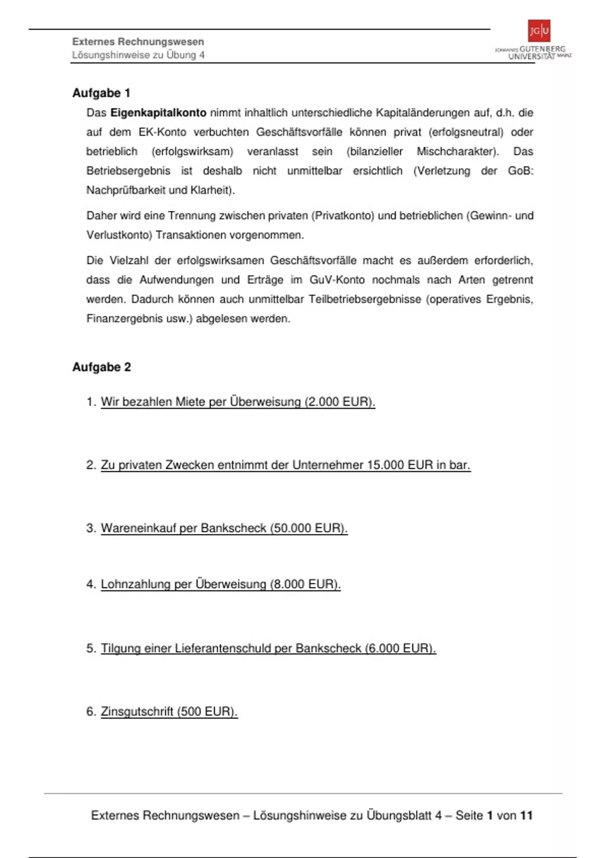 Externes Rechnungswesen – Lösungshinweise zu Übungsblatt 4 – Seite 1 von 11