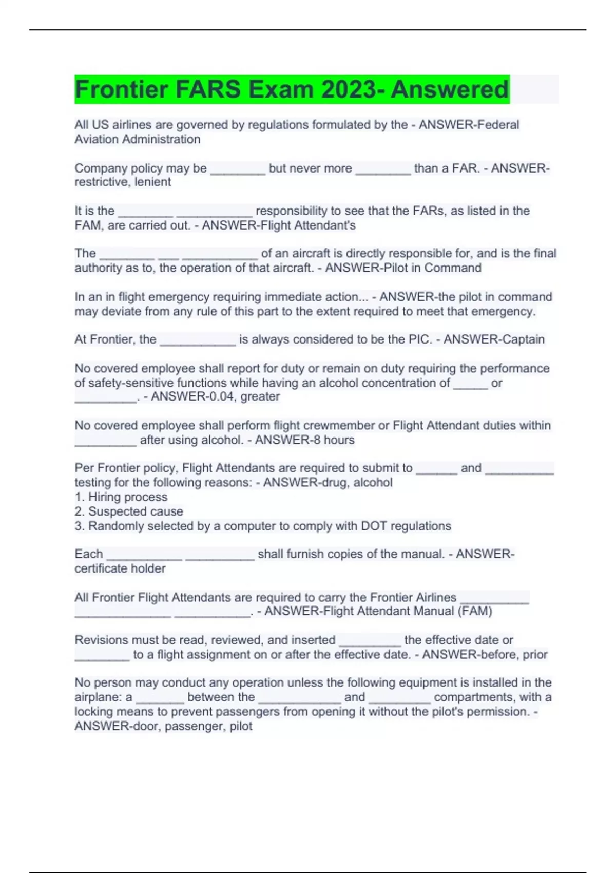 All US airlines are governed by regulations formulated by the - ANSWER-Federal Aviation Administration Company policy may be ________ but never more ________ than a FAR. - ANSWER-restrictive, lenient It is the ________ ___________ responsibility to see that the FARs, as listed in the FAM, are carried out. - ANSWER-Flight Attendant's The ________ ___ ___________ of an aircraft is directly responsible for, and is the final authority as to, the operation of that aircraft. - ANSWER-Pilot in Command In an in flight emergency requiring immediate action... - ANSWER-the pilot in command may deviate from any rule of this part to the extent required to meet that emergency. At Frontier, the ___________ is always considered to be the PIC. - ANSWER-Captain No covered employee shall report for duty or remain on duty requiring the performance of safety-sensitive functions while having an alcohol concentration of _____ or _________. - ANSWER-0.04, greater No covered employee shall perform flight crewmember or Flight Attendant duties within _________ after using alcohol. - ANSWER-8 hours Per Frontier policy, Flight Attendants are required to submit to ______ and __________ testing for the following reasons: - ANSWER-drug, alcohol 1. Hiring process 2. Suspected cause 3. Randomly selected by a computer to comply with DOT regulations Each ___________ __________ shall furnish copies of the manual. - ANSWER-certificate holder All Frontier Flight Attendants are required to carry the Frontier Airlines __________ ______________ ___________. - ANSWER-Flight Attendant Manual (FAM) Revisions must be read, reviewed, and inserted _________ the effective date or ________ to a flight assignment on or after the effective date. - ANSWER-before, prior No person may conduct any operation unless the following equipment is installed in the airplane: a _______ between the ____________ and _________ compartments, with a locking means to prevent passengers from opening it without the pilot's permission. - ANSWER-door, passenger, pilot