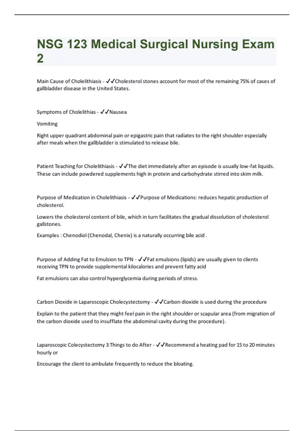 Main Cause of Cholelithiasis - Cholesterol stones account for most of the remaining 75% of cases of gallbladder disease in the United States. Symptoms of Cholelithias - Nausea Vomiting Right upper quadrant abdominal pain or epigastric pain that radiates to the right shoulder especially after meals when the gallbladder is stimulated to release bile. Patient Teaching for Cholelithiasis - The diet immediately after an episode is usually low-fat liquids. These can include powdered supplements high in protein and carbohydrate stirred into skim milk. Purpose of Medication in Cholelithiasis - Purpose of Medications: reduces hepatic production of cholesterol. Lowers the cholesterol content of bile, which in turn facilitates the gradual dissolution of cholesterol gallstones. Examples : Chenodiol (Chenodal, Chenix) is a naturally occurring bile acid . Purpose of Adding Fat to Emulsion to TPN - Fat emulsions (lipids) are usually given to clients receiving TPN to provide supplemental kilocalories and prevent fatty acid Fat emulsions can also control hyperglycemia during periods of stress. Carbon Dioxide in Laparoscopic Cholecystectomy - Carbon dioxide is used during the procedure Explain to the patient that they might feel pain in the right shoulder or scapular area (from migration of the carbon dioxide used to insufflate the abdominal cavity during the procedure). Laparoscopic Colecystectomy 3 Things to do After - Recommend a heating pad for 15 to 20 minutes hourly or Encourage the client to ambulate frequently to reduce the bloating.Manage nausea assess bowel sounds for further complications. Preoperative Assessment for Open Cholecystectomy - Priority assessment should focus on the client's respiratory status. If a traditional surgical approach is planned, the high abdominal incision required during surgery may interfere with full respiratory excursion. The nurse notes a history of smoking, previous respiratory problems, shallow respirations, a persistent or ineffective cough, and the presence of adventitious breath sounds. CBC and BMP should also be assessed 4 Postoperative Complications of Cholecystostomy - After these surgical procedures, the client is observed for indications of infection, leakage of bile into the peritoneal cavity, and obstruction of bile drainage.