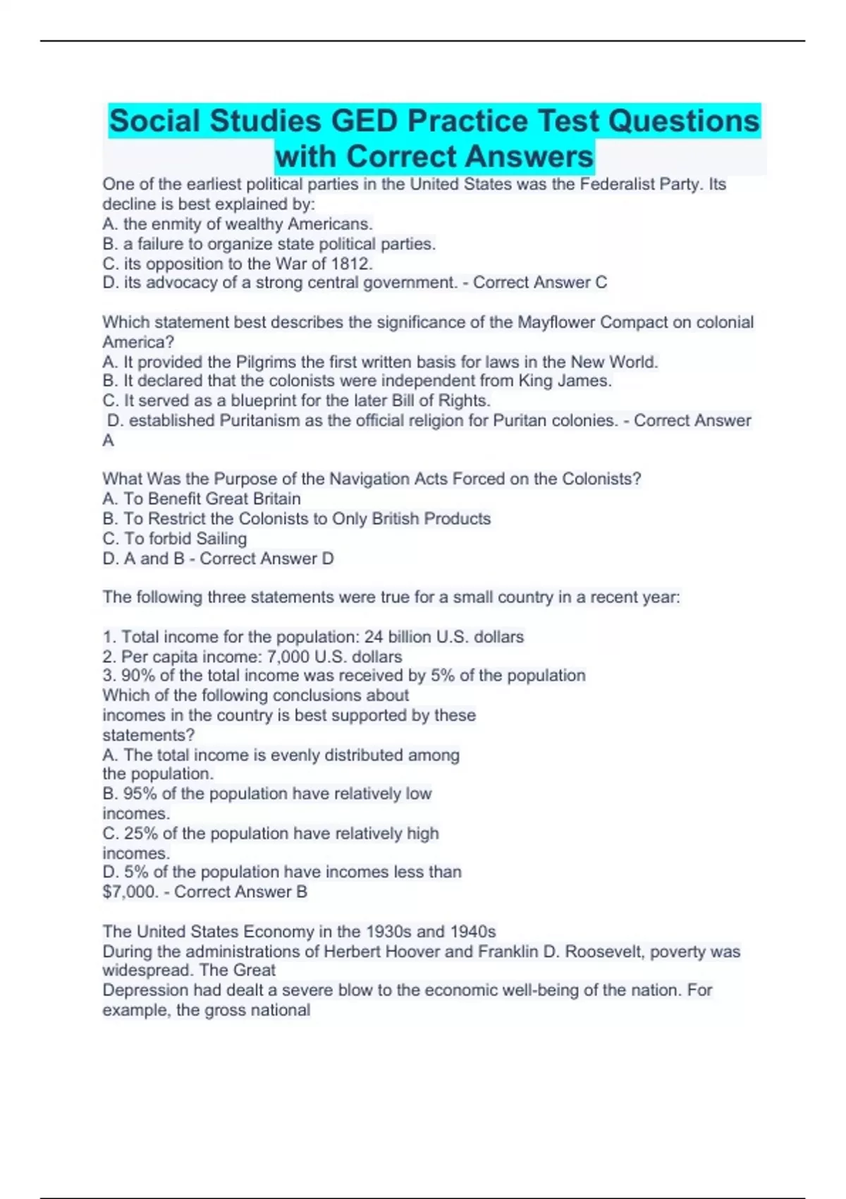One of the earliest political parties in the United States was the Federalist Party. Its decline is best explained by: A. the enmity of wealthy Americans. B. a failure to organize state political parties. C. its opposition to the War of 1812. D. its advocacy of a strong central government. - Correct Answer C Which statement best describes the significance of the Mayflower Compact on colonial America? A. It provided the Pilgrims the first written basis for laws in the New World. B. It declared that the colonists were independent from King James. C. It served as a blueprint for the later Bill of Rights. D. established Puritanism as the official religion for Puritan colonies. - Correct Answer A What Was the Purpose of the Navigation Acts Forced on the Colonists? A. To Benefit Great Britain B. To Restrict the Colonists to Only British Products C. To forbid Sailing D. A and B - Correct Answer D The following three statements were true for a small country in a recent year: 1. Total income for the population: 24 billion U.S. dollars 2. Per capita income: 7,000 U.S. dollars 3. 90% of the total income was received by 5% of the population Which of the following conclusions about incomes in the country is best supported by these statements? A. The total income is evenly distributed among the population. B. 95% of the population have relatively low incomes. C. 25% of the population have relatively high incomes. D. 5% of the population have incomes less than $7,000. - Correct Answer B The United States Economy in the 1930s and 1940s During the administrations of Herbert Hoover and Franklin D. Roosevelt, poverty was widespread. The Great Depression had dealt a severe blow to the economic well-being of the nation. For example, the gross national