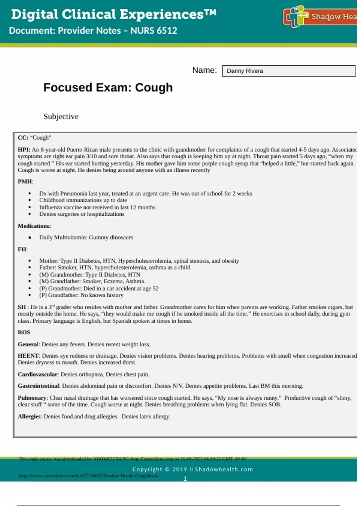 NURS 6512 Shadow Health, Cough Document: Provider Notes – NURS 6512
