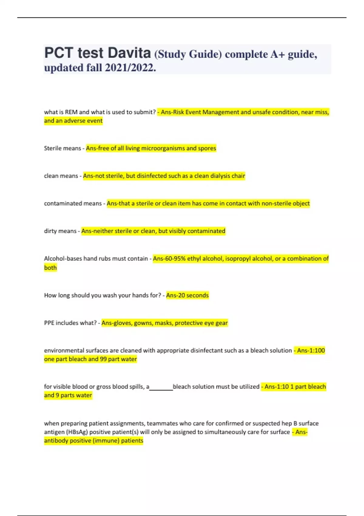 PCT test Davita (Study Guide) complete A+ guide, updated fall 2021/2022