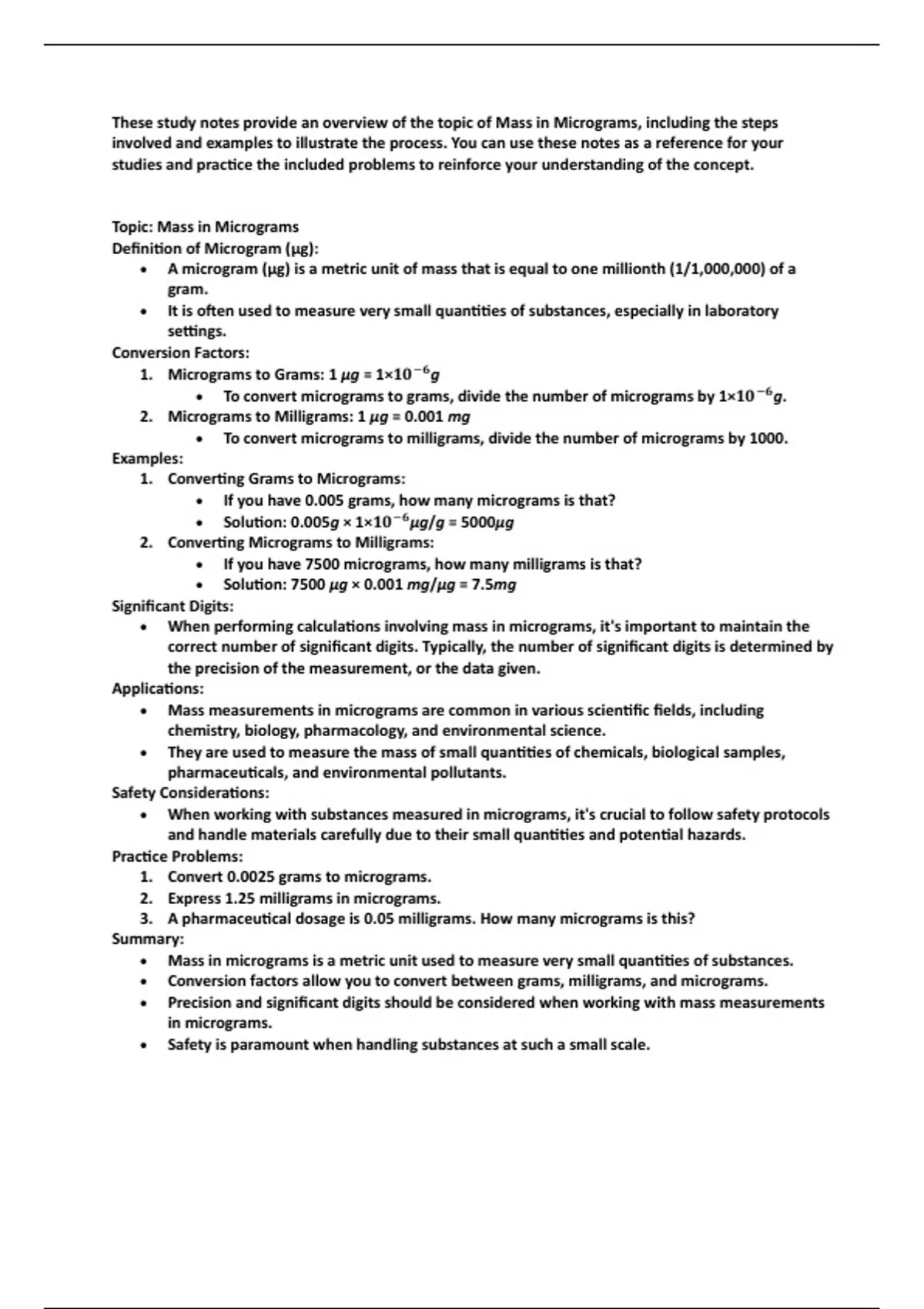 These study notes provide an overview of the topic of Mass in Micrograms, including the steps involved and examples to illustrate the process. You can use these notes as a reference for your studies and practice the included problems to reinforce your understanding of the concept.