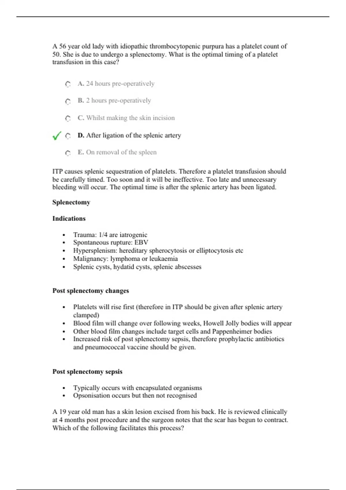 50. She is due to undergo a splenectomy. What is the optimal timing of a platelet