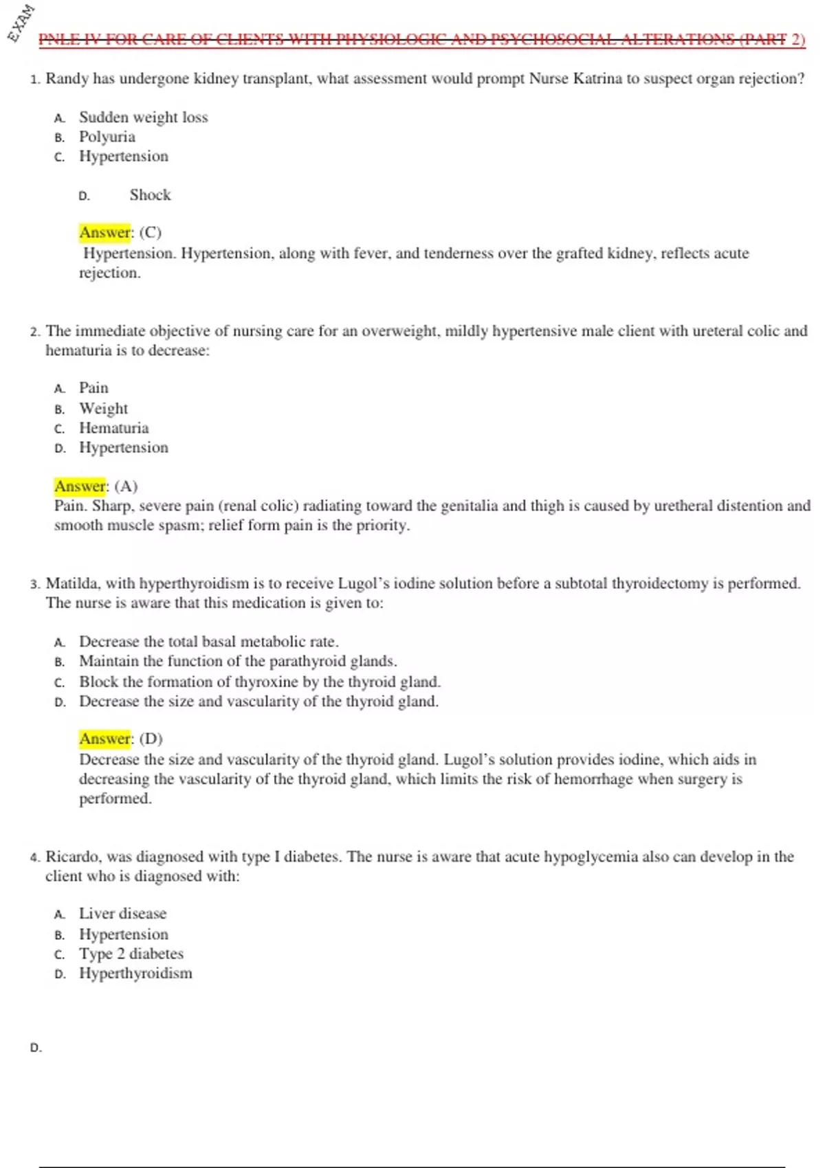 PNLE IV FOR CARE OF CLIENTS WITH PHYSIOLOGIC AND PSYCHOSOCIAL ALTERATIONS Randy has undergone kidney transplant, what assessment would prompt Nurse Katrina to suspect organ rejection? A. Sudden weight loss B. Polyuria C. Hypertension D. Shock Answer: (C) Hypertension. Hypertension, along with fever, and tenderness over the grafted kidney, reflects acute rejection. 2. The immediate objective of nursing care for an overweight, mildly hypertensive male client with ureteral colic and hematuria is to decrease: A. Pain B. Weight C. Hematuria D. Hypertension
