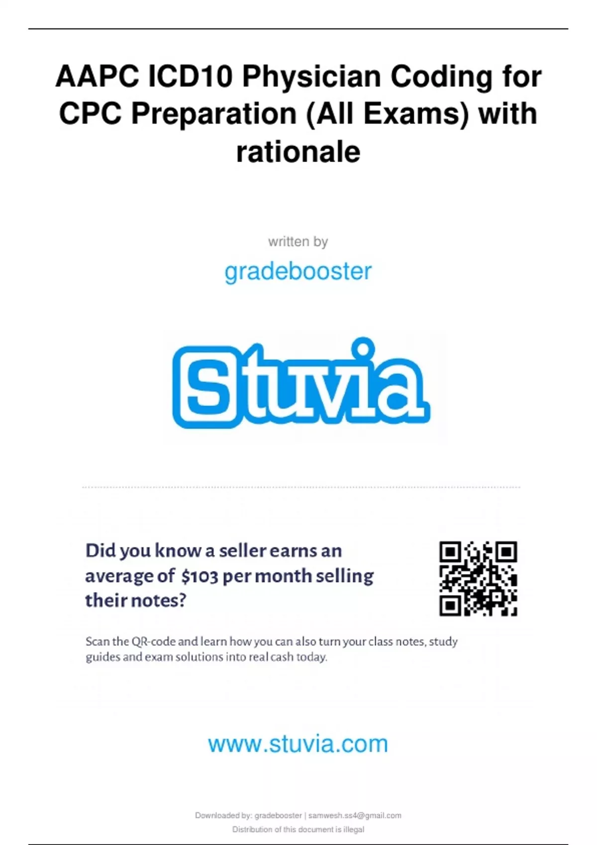 AAPC ICD10 Physician Coding for CPC Preparation (All Exams) with rationale written by gradebooster Downloaded by: gradebooster | Distribution of this document is illegal AAPC ICD10 Physician Coding for CPC Preparation (All Exams) Review Test Submissio n: Chapter 1 Quiz • Question 1 10 out of 10 points What document is referenced to when looking for potential problem areas identified by the government indicating scrutiny of the services within the coming year? Selected Answer: Correct Answer: Response Feedback: c. OIG Work Plan c. OIG Work Plan Rationale: Twice a year, the OIG releases a Work Plan outlining its priorities for the fiscal year ahead. Within the Work Plan, potential problem areas with claims submissions are listed and will be targeted with special scrutiny. • Question 2 0 out of 10 points According to the example LCD from Novitas Solutions, measurement of vitamin D levels is indicated for patients with which condition? Selected Answer: Correct Answer: Response Feedback: d. muscle weakness b. fibromyalgia Rationale: According to the LCD, measurement of vitamin D levels is indicated for patients with fibromyalgia.