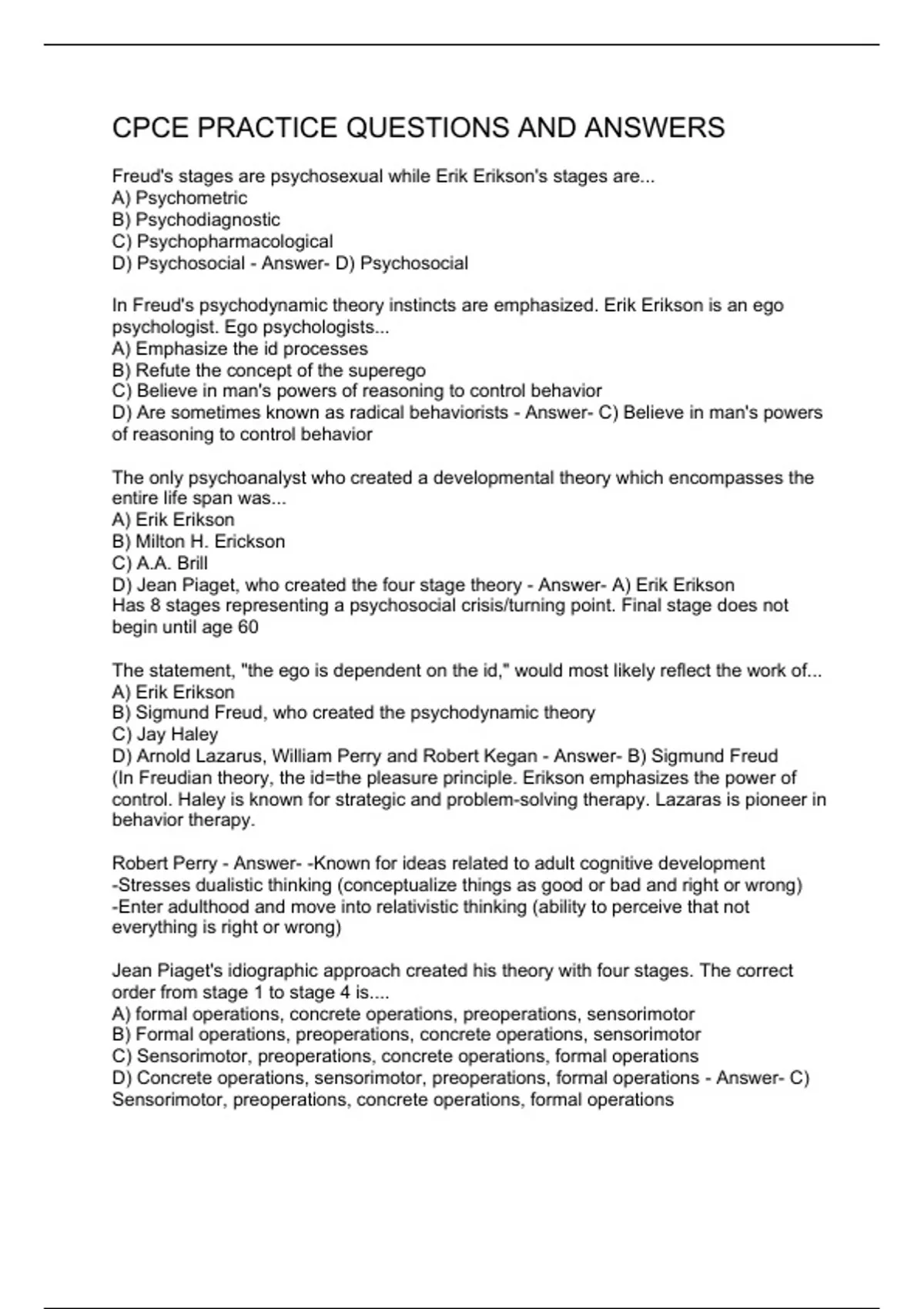 Freud's stages are psychosexual while Erik Erikson's stages are... A) Psychometric B) Psychodiagnostic C) Psychopharmacological D) Psychosocial - Answer- D) Psychosocial In Freud's psychodynamic theory instincts are emphasized. Erik Erikson is an ego psychologist. Ego psychologists... A) Emphasize the id processes B) Refute the concept of the superego C) Believe in man's powers of reasoning to control behavior D) Are sometimes known as radical behaviorists - Answer- C) Believe in man's powers of reasoning to control behavior The only psychoanalyst who created a developmental theory which encompasses the entire life span was... A) Erik Erikson B) Milton H. Erickson C) A.A. Brill D) Jean Piaget, who created the four stage theory - Answer- A) Erik Erikson Has 8 stages representing a psychosocial crisis/turning point. Final stage does not begin until age 60 The statement, "the ego is dependent on the id," would most likely reflect the work of... A) Erik Erikson B) Sigmund Freud, who created the psychodynamic theory C) Jay Haley D) Arnold Lazarus, William Perry and Robert Kegan - Answer- B) Sigmund Freud (In Freudian theory, the id=the pleasure principle. Erikson emphasizes the power of control. Haley is known for strategic and problem-solving therapy. Lazaras is pioneer in behavior therapy. Robert Perry - Answer- -Known for ideas related to adult cognitive development -Stresses dualistic thinking (conceptualize things as good or bad and right or wrong) -Enter adulthood and move into relativistic thinking (ability to perceive that not everything is right or wrong) Jean Piaget's idiographic approach created his theory with four stages. The correct order from stage 1 to stage 4 is.... A) formal operations, concrete operations, preoperations, sensorimotor B) Formal operations, preoperations, concrete operations, sensorimotor C) Sensorimotor, preoperations, concrete operations, formal operations D) Concrete operations, sensorimotor, preoperations, formal operations - Answer- C) Sen