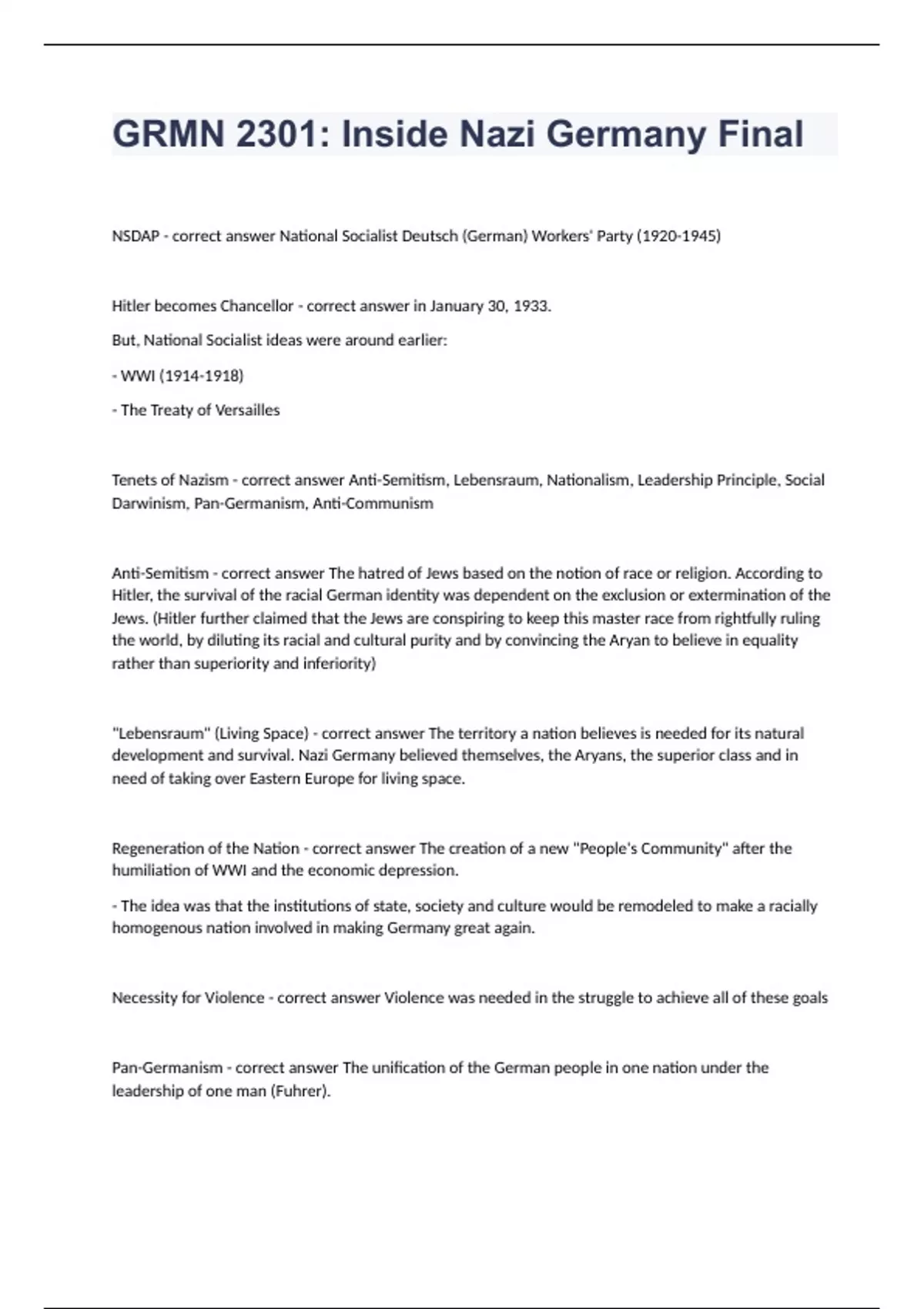GRMN 2301 Inside Nazi Germany Final Questions with complete solution 2023/2024NSDAP - correct answer National Socialist Deutsch (German) Workers' Party () Hitler becomes Chancellor - correct answer in January 30, 1933. But, National Socialist ideas were around earlier: - WWI () - The Treaty of Versailles Important dates - correct answer WWI -- Weimar Republic -- Hitler appointed Chancellor -- Jan 30, 1933 NSDAP -- Nazi Rule -- WWII -- 5 Tenets of Nazi Germany - correct answer 1) Anti-semitism 2) "Lebensraum"/Liv