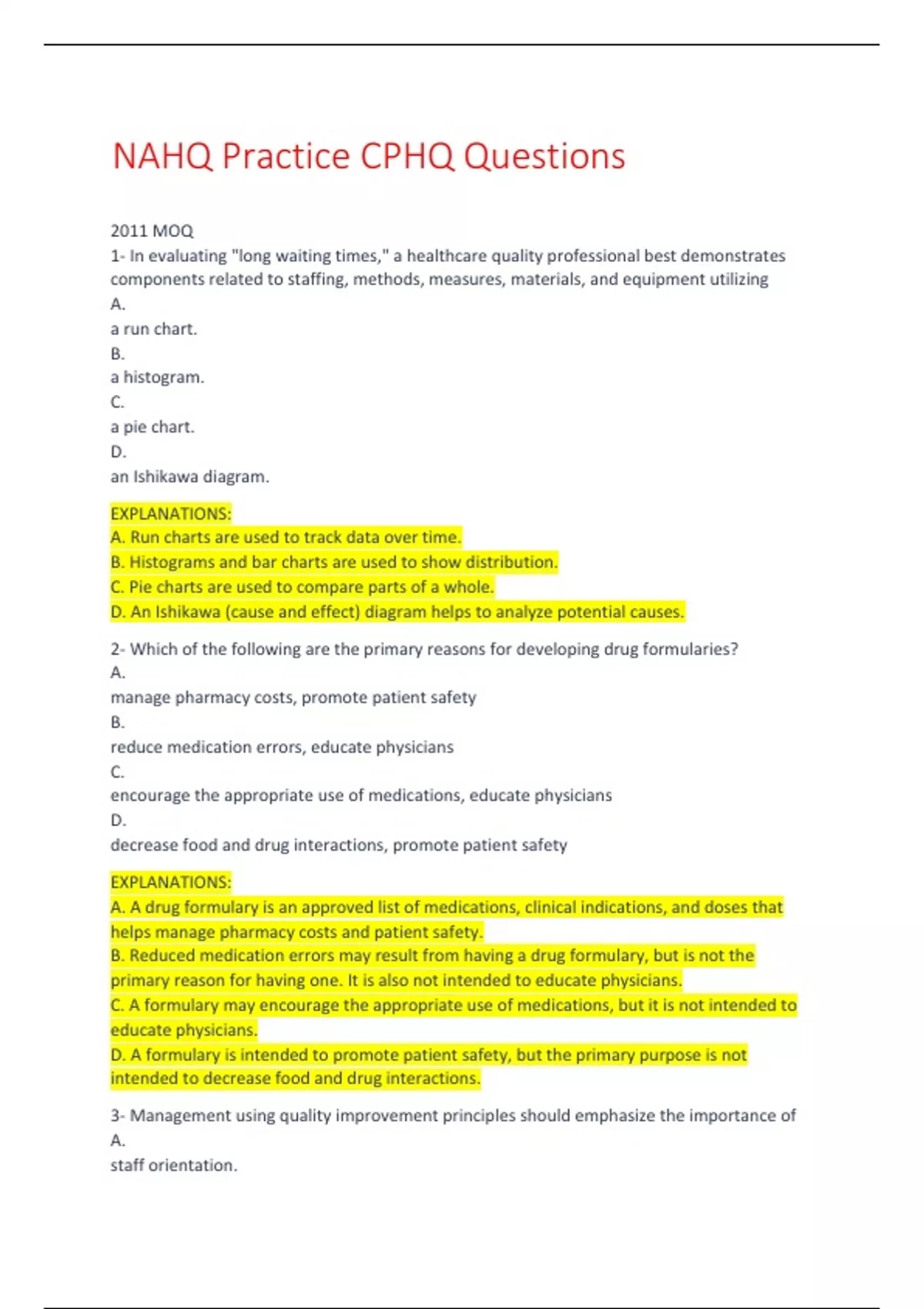 EXPLANATIONS: A. Run charts are used to track data over time. B. Histograms and bar charts are used to show distribution. C. Pie charts are used to compare parts of a whole. D. An Ishikawa (cause and effect) diagram helps to analyze potential causes. 2- Which of the following are the primary reasons for developing drug formularies? A. manage pharmacy costs, promote patient safety B. reduce medication errors, educate physicians C. encourage the appropriate use of medications, educate physicians D. decrease food and drug interactions, promote patient safety EXPLANATIONS: A. A drug formulary is an approved list of medications, clinical indications, and doses that helps manage pharmacy costs and patient safety. B. Reduced medication errors may result from having a drug formulary, but is not the primary reason for having one. It is also not intended to educate physicians. C. A formulary may encourage the appropriate use of medications, but it is not intended to educate physicians. D. A formulary is intended to promote patient safety, but the primary purpose is not intended to decrease food and drug interactions. 3- Management using quality improvement principles should emphasize the importance of A. staff orientation. B. customers' expectations. C. quarterly statistical reports. D. team selection. EXPLANATIONS: A. Staff orientation is only one component of quality improvement principles. B. The basis of quality improvement is knowing what the customer needs and wants. C. Quarterly statistical reports are only one component of quality improvement principles. D. Team selection is only one component of quality improvement principles. 4- Quality improvement teams are beneficial because they A. improve managerial control. B. promote competition and pride among members. C. maximize expertise and perspectives. D. authorize solutions to problems. EXPLANATIONS: A. Quality improvement teams do not affect managerial control. B. Promoting competition is not a function of quality improvement teams. C. A diverse team, including members with different experience and backgrounds, provides a broader knowledge base and outcomes. D. Authorizing solutions to problems is a function of management. 5- Which of the following is an essential component in a performance improvement report? A. governing body approval B. data analysis and display C. individual performance review D. team composition and attendance