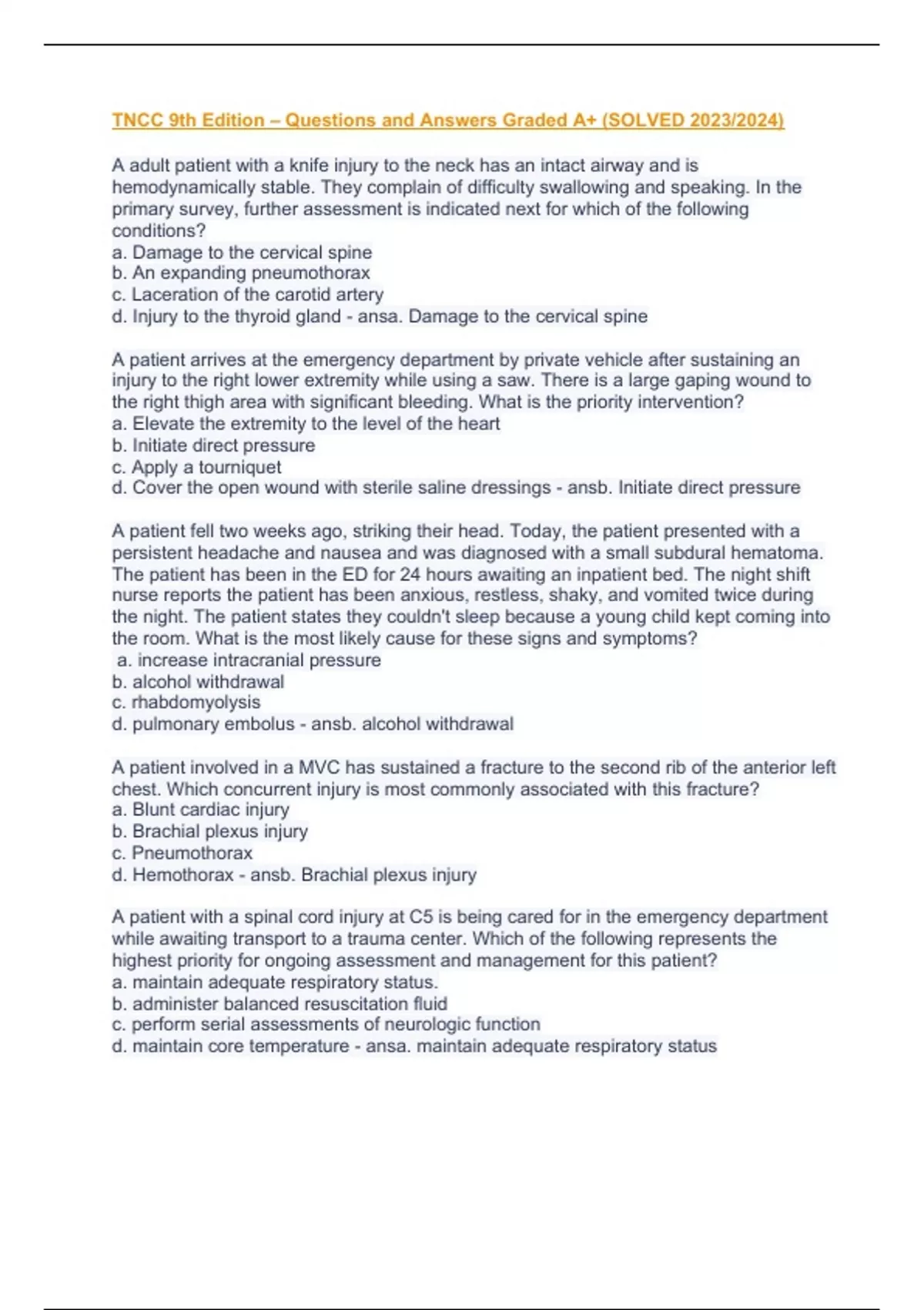 ,TNCC 9th Edition – Questions and Answers Graded A+ (SOLVED 2023/2024)