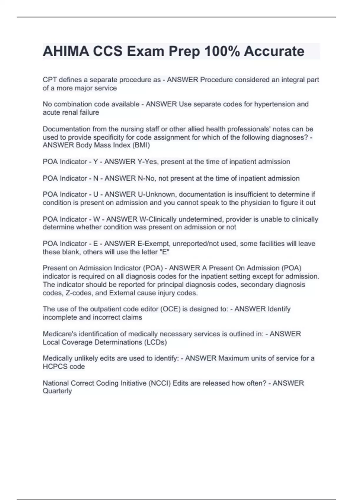CPT defines a separate procedure as - ANSWER Procedure considered an integral part of a more major service No combination code available - ANSWER Use separate codes for hypertension and acute renal failure Documentation from the nursing staff or other allied health professionals' notes can be used to provide specificity for code assignment for which of the following diagnoses? - ANSWER Body Mass Index (BMI) POA Indicator - Y - ANSWER Y-Yes, present at the time of inpatient admission POA Indicator - N - ANSWER N-No, not present at the time of inpatient admission POA Indicator - U - ANSWER U-Unknown, documentation is insufficient to determine if condition is present on admission and you cannot speak to the physician to figure it out POA Indicator - W - ANSWER W-Clinically undetermined, provider is unable to clinically determine whether condition was present on admission or not POA Indicator - E - ANSWER E-Exempt, unreported/not used, some facilities will leave these blank, others will use the letter "E" Present on Admission Indicator (POA) - ANSWER A Present On Admission (POA) indicator is required on all diagnosis codes for the inpatient setting except for admission. The indicator should be reported for principal diagnosis codes, secondary diagnosis codes, Z-codes, and External cause injury codes. The use of the outpatient code editor (OCE) is designed to: - ANSWER Identify incomplete and incorrect claims