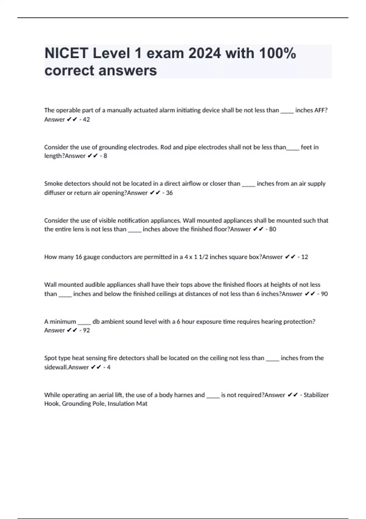 The operable part of a manually actuated alarm initiating device shall be not less than ____ inches AFF?Answer - 42 Consider the use of grounding electrodes. Rod and pipe electrodes shall not be less than____ feet in length?Answer - 8 Smoke detectors should not be located in a direct airflow or closer than ____ inches from an air supply diffuser or return air opening?Answer - 36 Consider the use of visible notification appliances. Wall mounted appliances shall be mounted such that the entire lens is not less than ____ inches above the finished floor?Answer - 80 How many 16 gauge conductors are permitted in a 4 x 1 1/2 inches square box?Answer - 12 Wall mounted audible appliances shall have their tops above the finished floors at heights of not less than ____ inches and below the finished ceilings at distances of not less than 6 inches?Answer - 90 A minimum ____ db ambient sound level with a 6 hour exposure time requires hearing protection?Answer - 92 Spot type heat s