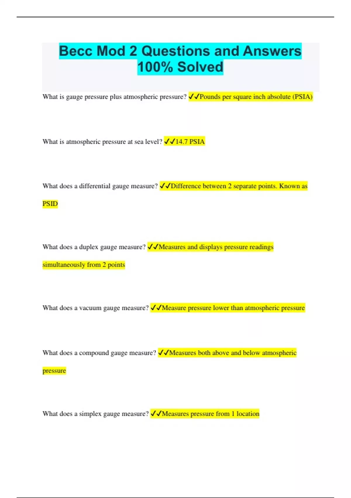 Becc Mod 2 Questions and Answers 100% Solved What is gauge pressure plus atmospheric pressure? Pounds per square inch absolute (PSIA) What is atmospheric pressure at sea level? 14.7 PSIA What does a differential gauge measure? Difference between 2 separate points. Known as PSID What does a duplex gauge measure? Measures and displays pressure readings simultaneously from 2 points What does a vacuum gauge measure? Measure pressure lower than atmospheric pressure What does a compound gauge measure? Measures both above and below atmospheric pressure What does a simplex gauge measure? Measures pressure from 1 location Which gauge is constructed of 2 Bourdon Tubes and 1 needle? Differential gauge Which gauge is constructed of 2 Bourdon Tubes and 2 needles? Duplex gauge What is a vacuum gauge measured in? Inches of water or inches of Mercury (InHg) What measuring device uses 2 dissimilar metals? Bimetallic expansion Which thermometer is also known as a distant reading thermometer? Filled system thermometer What does a filled system thermometer consists of? A hollow metal sensing bulb at one end of a small bore tube. The other end is connected to a Bourdon tube What is the oldest, simplest, most widely used thermometer? Liquid-in-glass thermometer What thermometer is used to measure temperatures betw