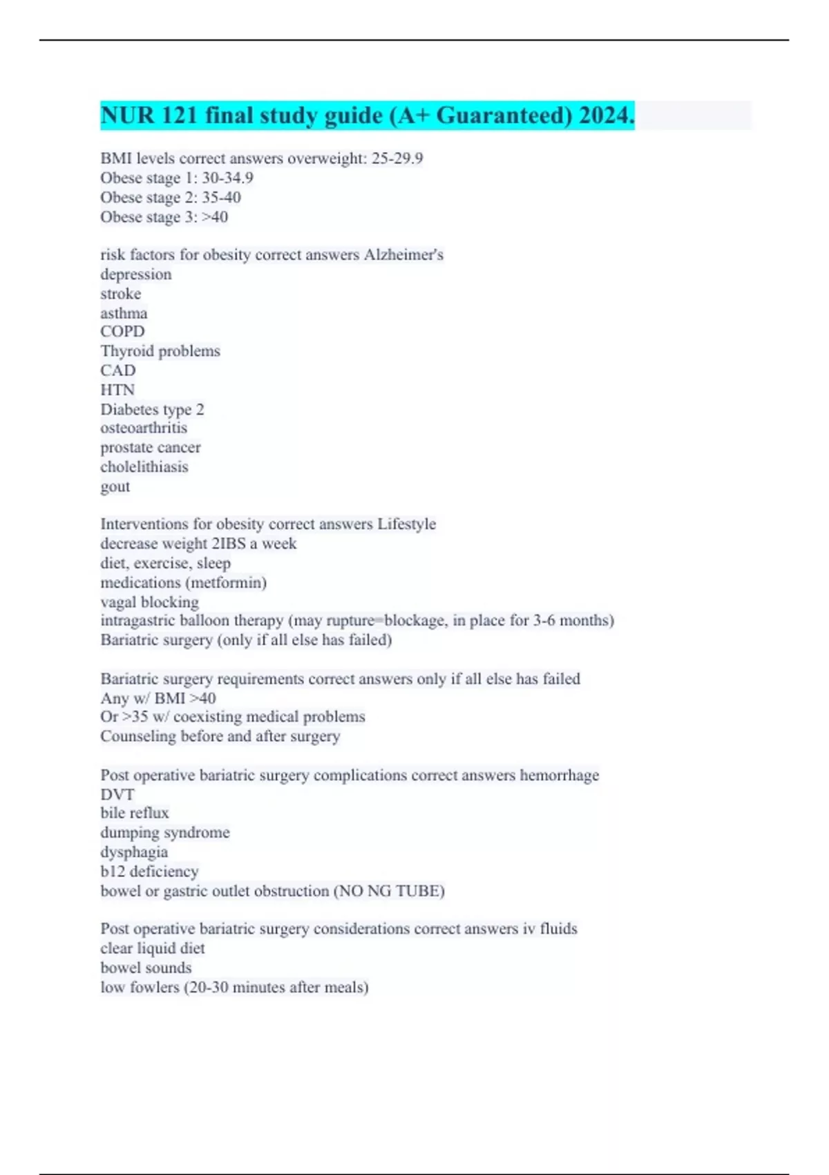 BMI levels correct answers overweight: 25-29.9 Obese stage 1: 30-34.9 Obese stage 2: 35-40 Obese stage 3: 40 risk factors for obesity correct answers Alzheimer's depression stroke asthma COPD Thyroid problems CAD HTN Diabetes type 2 osteoarthritis prostate cancer cholelithiasis gout Interventions for obesity correct answers Lifestyle decrease weight 2IBS a week diet, exercise, sleep medications (metformin) vagal blocking intragastric balloon therapy (may rupture=blockage, in place for 3-6 months) Bariatric surgery (only if all else has failed) Bariatric surgery requirements correct answers only if all else has failed Any w/ BMI 40 Or 35 w/ coexisting medical problems Counseling before and after surgery Post operative bariatric surgery complications correct answers hemorrhage DVT bile reflux dumping syndrome dysphagia b12 deficiency bowel or gastric outlet obstruction (NO NG TUBE) Post operative bariatric surgery considerations correct answers iv fluids clear liquid diet bowel sounds low fowlers (20-30 minutes after meals)