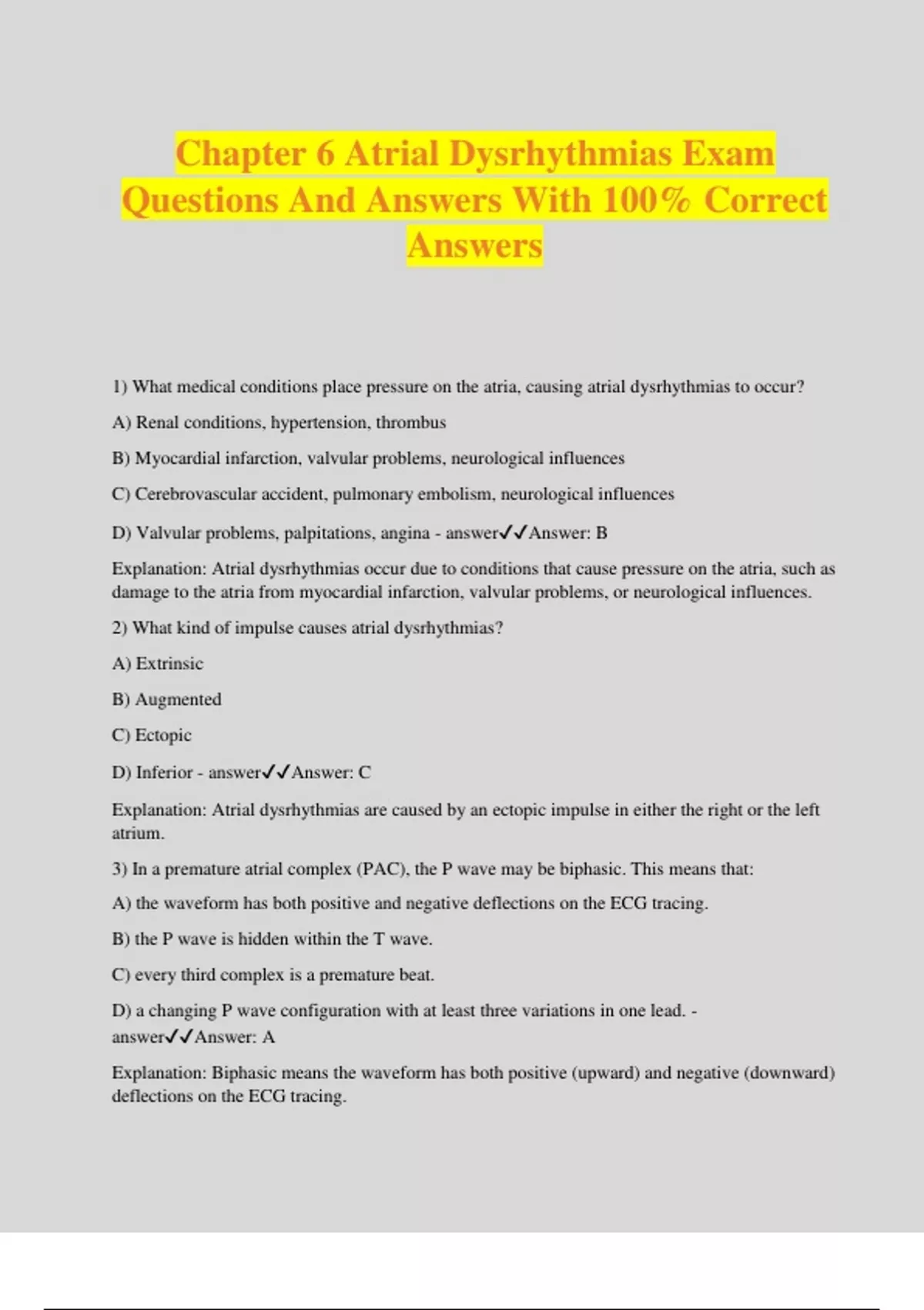 Chapter 6 Atrial Dysrhythmias Exam Questions And Answers With 100% Correct Answers 1) What medical conditions place pressure on the atria, causing atrial dysrhythmias to occur? A) Renal conditions, hypertension, thrombus B) Myocardial infarction, valvular problems, neurological influences C) Cerebrovascular accident, pulmonary embolism, neurological influences D) Valvular problems, palpitations, angina - answerAnswer: B Explanation: Atrial dysrhythmias occur due to conditions that cause pressure on the atria, such as damage to the atria from myocardial infarction, valvular problems, or neurological influences. 2) What kind of impulse causes atrial dysrhythmias? A) Extrinsic B) Augmented C) Ectopic D) Inferior - answerAnswer: C Explanation: Atrial dysrhythmias are caused by an ectopic impulse in either the right or the left atrium. 3) In a premature atrial complex (PAC), the P wave may be biphasic. This means that: A) the waveform has both positive and negative deflections on the ECG tracing. B) the P wave is hidden within the T wave. C) every third complex is a premature beat. D) a changing P wave configuration with at least three variations in one lead. - answerAnswer: A Explanation: Biphasic means the waveform has both positive (upward) and negative (downward) deflections on the ECG tracing. 4) A pattern in which every third complex is a premature beat is referred to as: A) bigeminy. B) quadgeminy. C) trigeminy. D) triphasic. - answerAnswer: C Explanation: Trigeminy is a pattern in which every third complex is a premature beat. 5) Which atrial dysrhythmia has a cardiac complex that occurs too soon and may have abnormal P waves, but other than being ''early,'' has no other abnormal features? A) Atrial flutter B) Atrial fibrillation C) Wandering atrial pacemaker (WAP) D) Premature atrial complexes (PAC) - answerAnswer: D Explanation: A premature atrial complex is a cardiac complex that occurs too soon. The P wave on the early complexes may be abnormal, but the other criteria are within the normal ranges. 6) A cardiac cell or group of cells that produces an ectopic beat is known as a: A) focus. B) fusion. C) flutter. D) fascicle. - answerAnswer: A Explanation: A focus is a cardiac cell or group of cells that produces an ectopic beat. 7) How many different P wave configurations in the same lead indicate a wandering atrial pacemaker (WAP)? A) Two B) Three C) Four D) None - answerAnswer: B Explanation: At least three different P wave configurations in the same lead indicate a wandering atrial pacemaker (WAP). 8) WAP is a normal finding in children, older adults, and well-conditioned athletes. It may also be found in patients with: A) congestive heart failure and hypertension. B) cardiovascular disease and metabolic disorder. C) neurological disorders and renal insufficiency. D) organic heart disease and drug toxicity. - answerAnswer: D Explanation: WAP is a normal finding