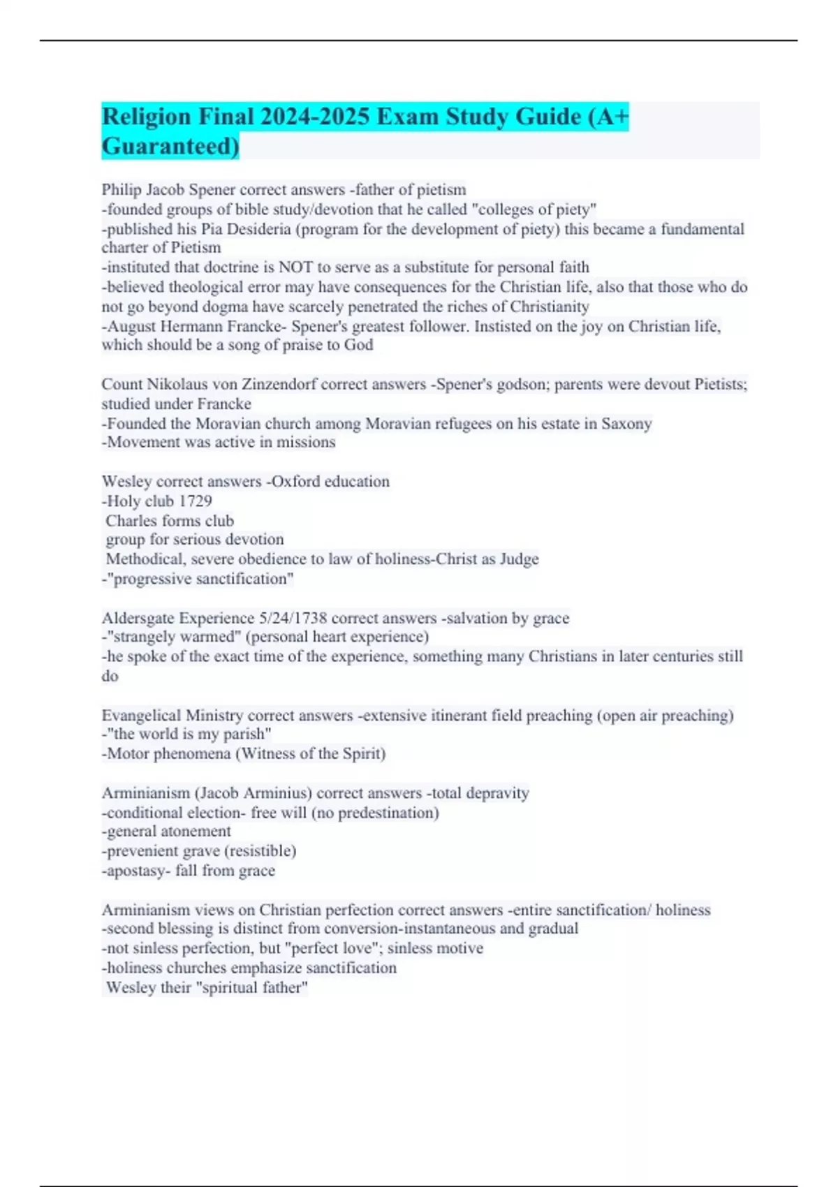 Philip Jacob Spener correct answers -father of pietism -founded groups of bible study/devotion that he called "colleges of piety" -published his Pia Desideria (program for the development of piety) this became a fundamental charter of Pietism -instituted that doctrine is NOT to serve as a substitute for personal faith -believed theological error may have consequences for the Christian life, also that those who do not go beyond dogma have scarcely penetrated the riches of Christianity -August Hermann Francke- Spener's greatest follower. Instisted on the joy on Christian life, which should be a song of praise to God Count Nikolaus von Zinzendorf correct answers -Spener's godson; parents were devout Pietists; studied under Francke -Founded the Moravian church among Moravian refugees on his estate in Saxony -Movement was active in missions Wesley correct answers -Oxford education -Holy club 1729 Charles forms club group for serious devotion Methodical, severe obedience to law of holiness-Christ as Judge -"progressive sanctification" Aldersgate Experience 5/24/1738 correct answers -salvation by grace -"strangely warmed" (personal heart experience) -he spoke of the exact time of the experience, something many Christians in later centuries still do Evangelical Ministry correct answers -extensive itinerant field preaching (open air preaching) -"the world is my parish" -Motor phenomena (Witness of the Spirit) Arminianism (Jacob Arminius) correct answers -total depravity -conditional election- free will (no predestination) -general atonement -prevenient grave (resistible) -apostasy- fall from grace Arminianism views on Christian perfection correct answers -entire sanctification/ holiness -second blessing is distinct from conversion-instantaneous and gradual -not sinless perfection, but "perfect love"; sinless motive -holiness churches emphasize sanctification Wesley their "spiritual father"