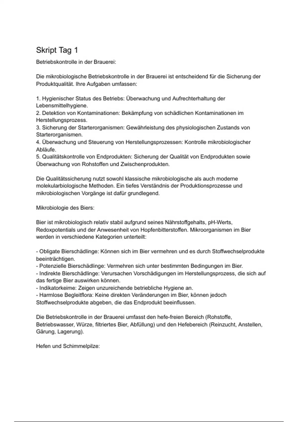 Betriebswasser, Würze, filtriertes Bier, Abfüllung) und den Hefebereich (Reinzucht, Anstellen,