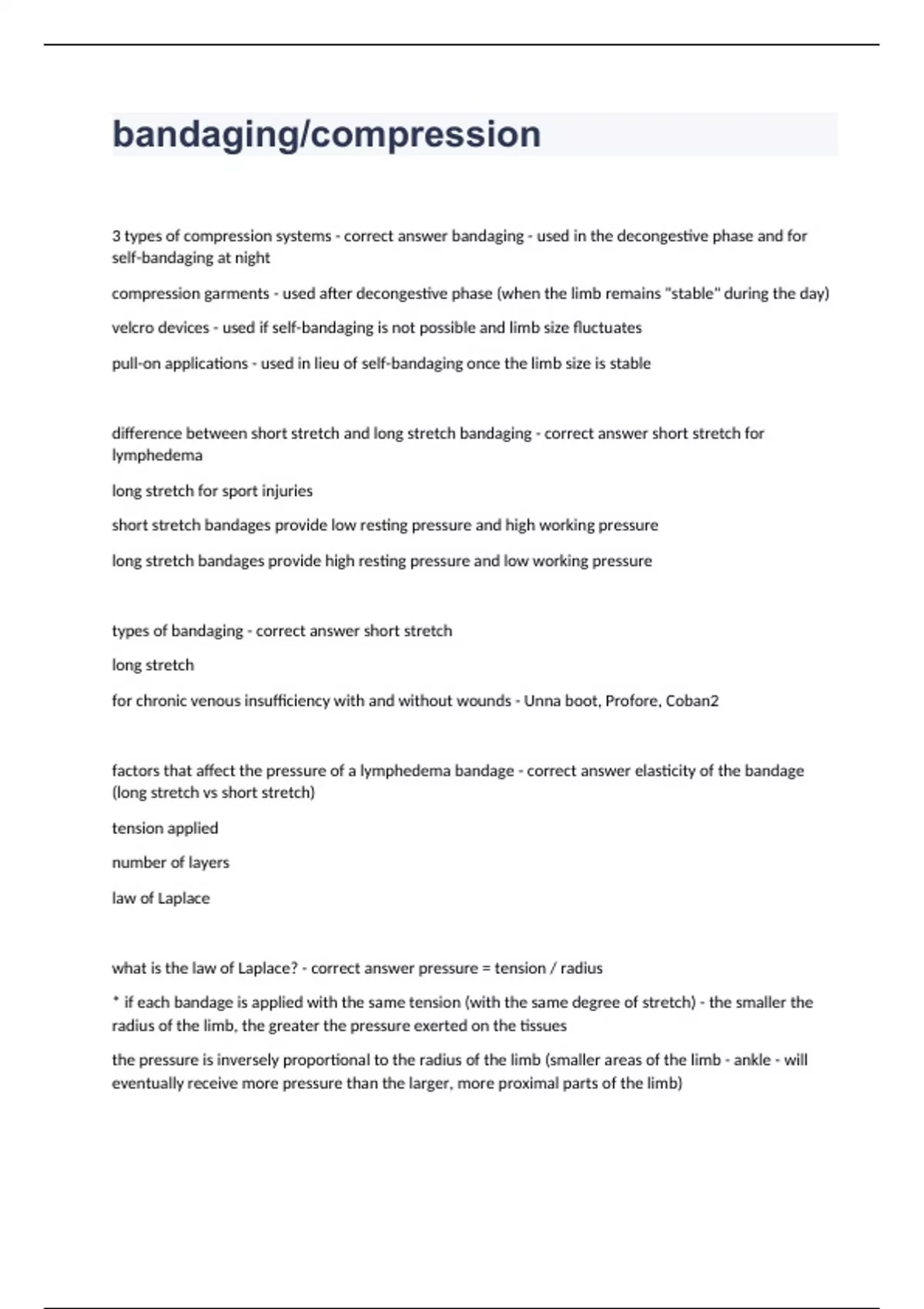 bandaging/compression3 types of compression systems - correct answer bandaging - used in the decongestive phase and for self-bandaging at night compression garments - used after decongestive phase (when the limb remains "stable" during the day) velcro devices - used if self-bandaging is not possible and limb size fluctuates pull-on applications - used in lieu of self-bandaging once the limb size is stable difference between short stretch and long stretch bandaging - correct answer short stretch for lymphedema long stretch for sport injuries short stretch bandages provide low resting pressure and high working pressure long stretch bandages provide high resting pressure and low working pressure types of bandaging - correct answer short stretch long stretch for chronic venous insufficiency with and without wounds - Unna boot, Profore, Coban2 factors that affect the pressure of a lymphedema bandage - correct answer elasticity of the bandage (long stretch vs short stretch) tension applied number of layers law of Laplace what is the law of Laplace? - correct answer pressure = tension / radius * if each bandage is applied with the same tension (with the same degree of stretch) - the smaller the radius of the limb, the greater the pressure exerted on the tissues the pressure is inversely proportional to the radius of the limb (smaller areas of the limb - ankle - will eventually receive more pressure than the larger, more proximal parts of the limb)