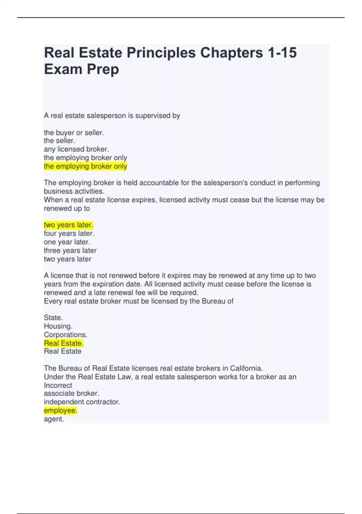 Real Estate Principles Chapters 1-15 Exam Prep A real estate salesperson is supervised by the buyer or seller. the seller. any licensed broker. the employing broker only the employing broker only The employing broker is held accountable for the salesperson's conduct in performing business activities. When a real estate license expires, licensed activity must cease but the license may be renewed up to two years later. four years later. one year later. three years later two years later A license that is not renewed before it expires may be renewed at any time up to two years from the expiration date. All licensed activity must cease before the license is renewed and a late renewal fee will be required. Every real estate broker must be licensed by the Bureau of State. Housing. Corporations. Real Estate. Real Estate The Bureau of Real Estate licenses real estate brokers in California. Under the Real Estate Law, a real estate salesperson works for a broker as an Incorrect associate broker. independent contractor. employee. agent.
