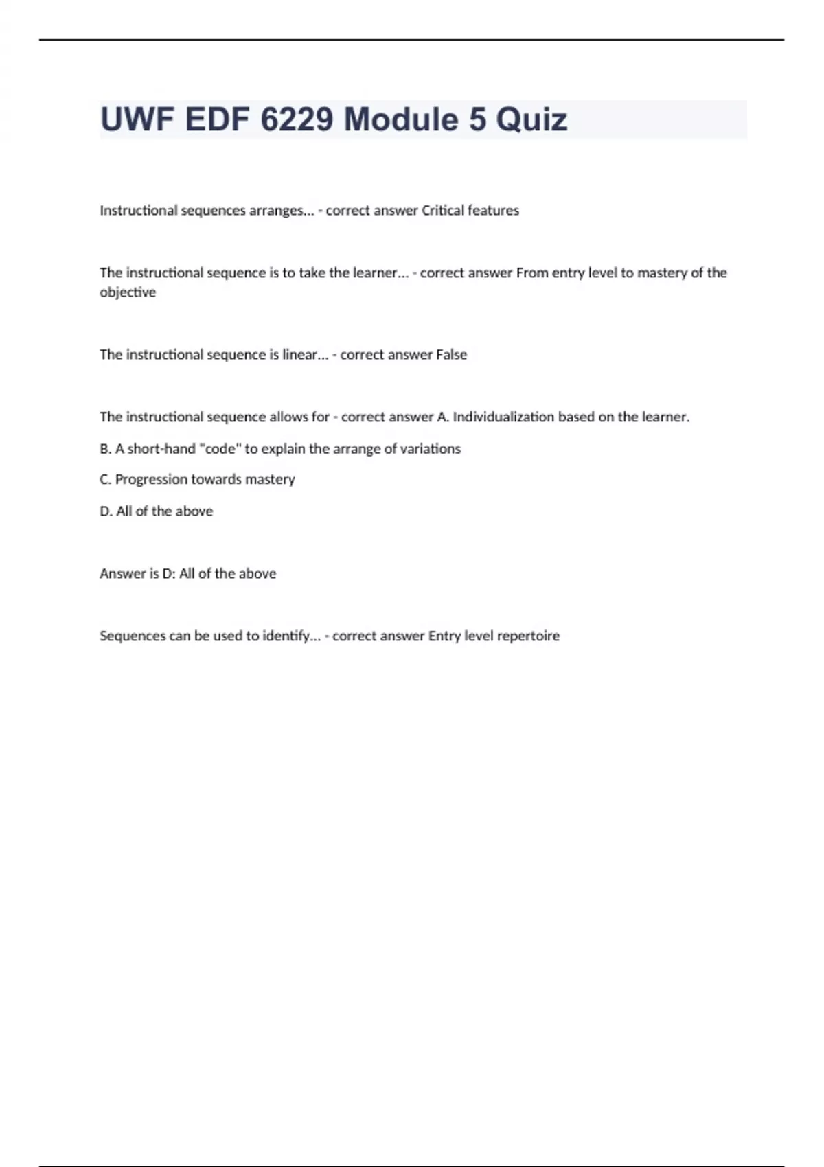 UWF EDF 6229 Module 5 Quiz Question and answers rated A+ 2024 Instructional sequences arranges... - correct answer Critical features The instructional sequence is to take the learner... - correct answer From entry level to mastery of the objective The instructional sequence is linear... - correct answer False The instructional sequence allows for - correct answer A. Individualization based on the learner. B. A short-hand "code" to explain the arrange of variations C. Progression towards mastery D. All of the above Answer is D: All of the above Sequences can be used to ident
