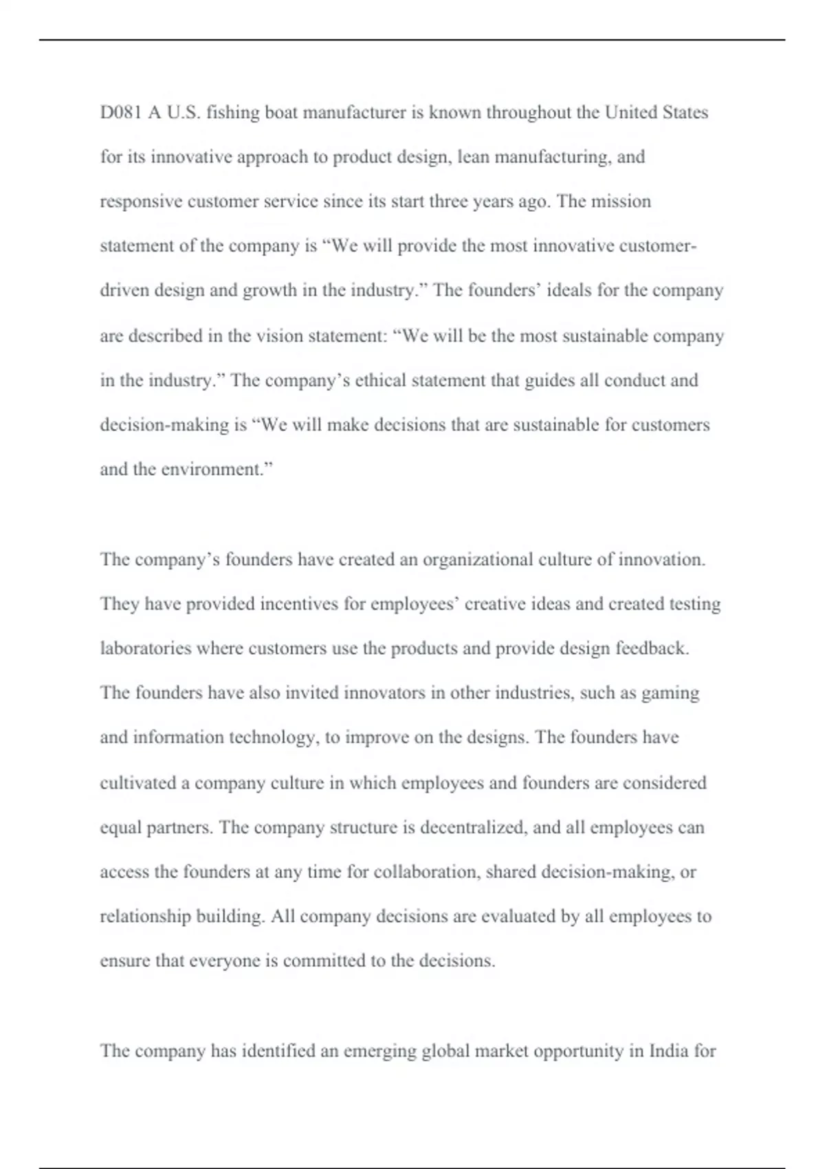 D081 A U.S. fishing boat manufacturer is known throughout the United States for its innova D081 A U.S. fishing boat manufacturer is known throughout the United States for its innovative approach to product design, lean manufacturing, and responsive customer service since its start three years ago. The mission statement of the company is €œWe will provide the most innovative customer-driven design and growth in the industry.€ The founders€™ ideals for the company are described in the vision statement: €œWe will be the most sustainable company in the industry.€ The company€™s ethical statement that guides all conduct and decision-making is €œWe will make decisions that are sustainable for customers and the environment.€ The company€™s founders have created an organizational culture of innovation. They have provided incentives for employees€™ creative ideas and created testing laboratories where customers use the products and provide design feedback. The founders have also in