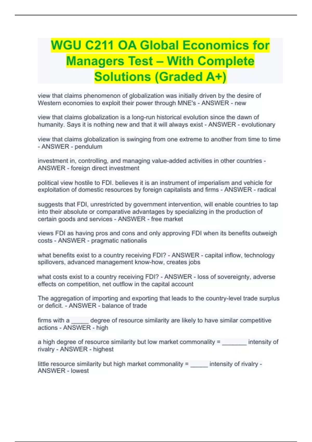 WGU C211 OA Global Economics for Managers Test – With Complete Solutions (Graded A+)