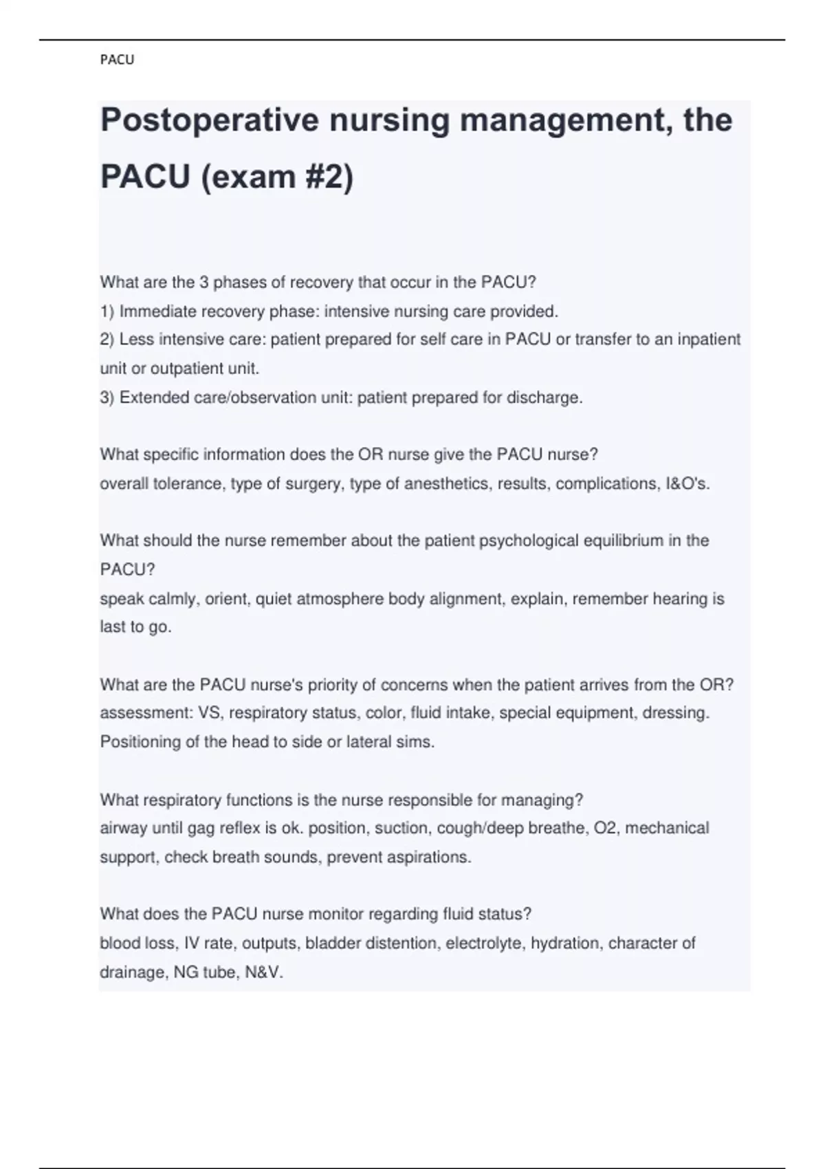 Postoperative nursing management, the PACU (exam #2) What are the 3 phases of recovery that occur in the PACU? 1) Immediate recovery phase: intensive nursing care provided. 2) Less intensive care: patient prepared for self care in PACU or transfer to an inpatient unit or outpatient unit. 3) Extended care/observation unit: patient prepared for discharge. What specific information does the OR nurse give the PACU nurse? overall tolerance, type of surgery, type of anesthetics, results, complications, I&O's. What should the nurse remember about the patient psychological equilibrium in the PACU? speak calmly, orient, quiet atmosphere body alignment, explain, remember hearing is last to go. What are the PACU nurse's priority of concerns when the patient arrives from the OR? assessment: VS, respiratory status, color, fluid intake, special equipment, dressing. Positioning of the head to side or lateral sims. What respiratory functions is the nurse responsible for managing? airway until gag reflex is ok. position, suction, cough/deep breathe, O2, mechanical support, check breath sounds, prevent aspirations.
