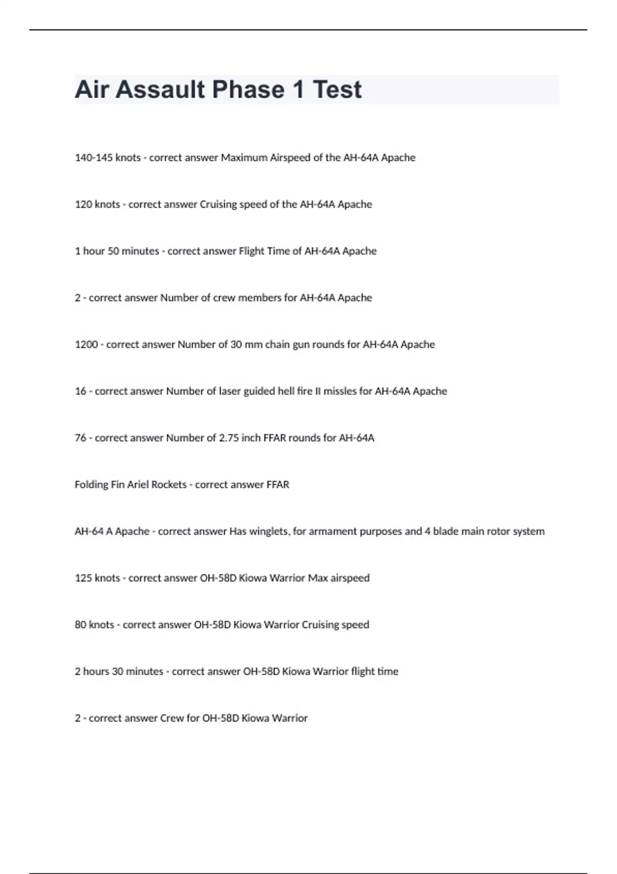 Air Assault Phase 1 Test 140-145 knots - correct answer Maximum Airspeed of the AH-64A Apache 120 knots - correct answer Cruising speed of the AH-64A Apache 1 hour 50 minutes - correct answer Flight Time of AH-64A Apache 2 - correct answer Number of crew members for AH-64A Apache 1200 - correct answer Number of 30 mm chain gun rounds for AH-64A Apache 16 - correct answer Number of laser guided hell fire II missles for AH-64A Apache 76 - correct answer Number of 2.75 inch FFAR rounds for AH-64A Folding Fin Ariel Rockets - correct answer FFAR AH-64 A Apache - correct answer Has winglets, for armament purposes and 4 blade main rotor system 125 knots - correct answer OH-58D Kiowa Warrior Max airspeed 80 knots - correct answer OH-58D Kiowa Warrior Cruising speed 2 hours 30 minutes - correct answer OH-58D Kiowa Warrior flight time 2 - correct answer Crew for OH-58D Kiowa Warrior