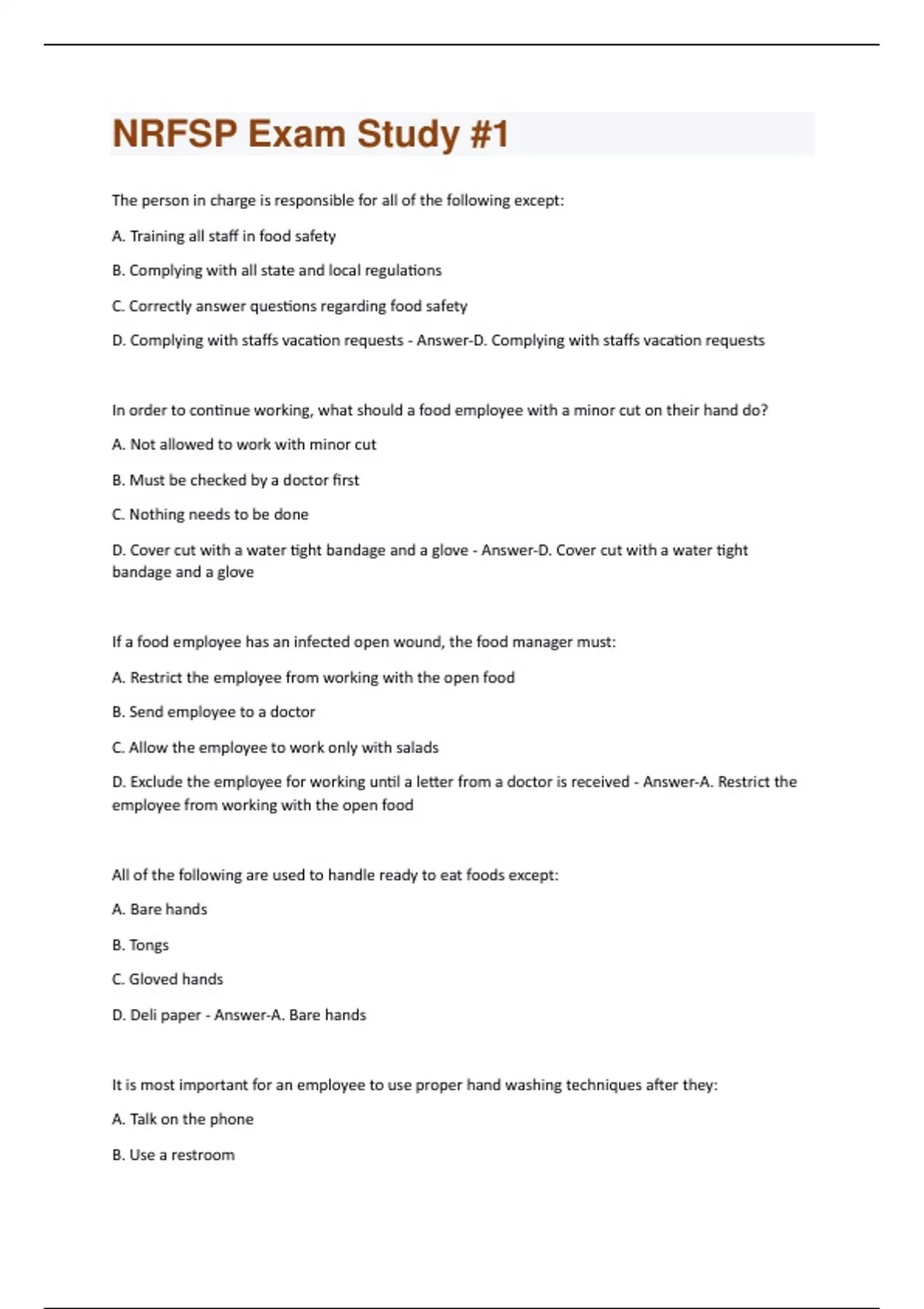 The person in charge is responsible for all of the following except: A. Training all staff in food safety B. Complying with all state and local regulations C. Correctly answer questions regarding food safety D. Complying with staffs vacation requests - Answer-D. Complying with staffs vacation requests In order to continue working, what should a food employee with a minor cut on their hand do? A. Not allowed to work with minor cut B. Must be checked by a doctor first C. Nothing needs to be done D. Cover cut with a water tight bandage and a glove - Answer-D. Cover cut with a water tight bandage and a glove If a food employee has an infected open wound, the food manager must: A. Restrict the employee from working with the open food B. Send employee to a doctor C. Allow the employee to work only with salads D. Exclude the employee for working until a letter from a doctor is received - Answer-A. Restrict the employee from working with the open food All of the following are used to handle ready to eat foods except: A. Bare hands B. Tongs C. Gloved hands D. Deli paper - Answer-A. Bare hands It is most important for an employee to use proper hand washing techniques after they: A. Talk on the phone B. Use a restroomC. Take an order D. Drink from a closed container - Answer-B. Use a restroom An inspection can occur only: A. When the person in charge is present B. When the inspector notified the facility 24 hours in advance C. When the facility is open or during reasonable hours D. When the facility is not too busy - Answer-C. When the facility is open or during reasonable hours
