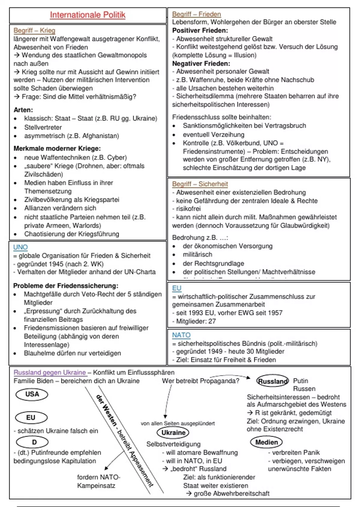 In dieser 25-seitigen Übersicht sind u.a. folgende für das Abitur (GRW/Gemeinschaftskunde/Politik & Wirtschaft) relevante Themen kompakt aufbereitet: Krieg & Frieden, Wirtschaft und Wirtschaftspolitik, Internationale Politik, EU, UNO, NATO, Medien im politischen Prozess, Identitätspolitik, Sozialisation, Wahlen in der Bundesrepublik, WHO und einiges mehr.