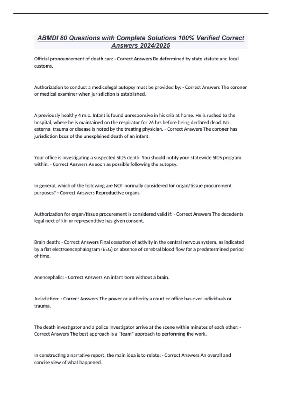 ABMDI 80 Questions with Complete Solutions 100% Verified Correct Answers 2024/2025 Official pronouncement of death can: - Correct Answers Be defermined by state statute and local customs. Authorization to conduct a medicolegal autopsy must be provided by: - Correct Answers The coroner or medical examiner when jurisdiction is established. A previously healthy 4 m.o. Infant is found unresponsive in his crib at home. He is rushed to the hospital, where he is maintained on the respirator for 26 hrs before being declared dead. No external trauma or disease is noted by the treating physician. - Correct Answers The coroner has jurisdiction bcuz of the unexplained death of an infant. Your office is investigating a suspected SIDS death. You should notify your statewide SIDS program within: - Correct Answers As soon as possible following the autopsy. In general, which of the following are NOT normally considered for organ/tissue procurement purposes? - Correct Answers Reproductive organs Authorization for organ/tissue procurement is considered valid if: - Correct Answers The decedents legal next of kin or representitive has given consent. Brain death: - Correct Answers Final cessation of activity in the central nervous system, as indicated by a flat electroencephalogram (EEG) or absence of cerebral blood flow for a predetermined period of time. Anencephalic: - Correct Answers An infant born without a brain. Jurisdiction: - Correct Answers The power or authority a court or office has over individuals or trauma. The death investigator and a police investigator arrive at the scene within minutes of each other: - Correct Answers The best approach is a "team" approach to performing the work. In constructing a narrative report, the main idea is to relate: - Correct Answers An overall and concise view of what happened. Choose one of the most important important communication skills for gathering information at the scene: - Correct Answers Listen and actively study witnesses. The pathologist must be altered to religious requests from the family: - Correct Answers Before the autopsy is performed. When communicating with the pathologist, a good investigator distinguishes between a request for information and a request for an opinion. Which type is this, " what time was the death pronounced?" - Correct Answers Request for information. Common law marriage: - Correct Answers Marriage that is recognized because the couple have been cohabiting for a determined length of time, but there has been no legal ceremony. Disinterment - Correct Answers The openin